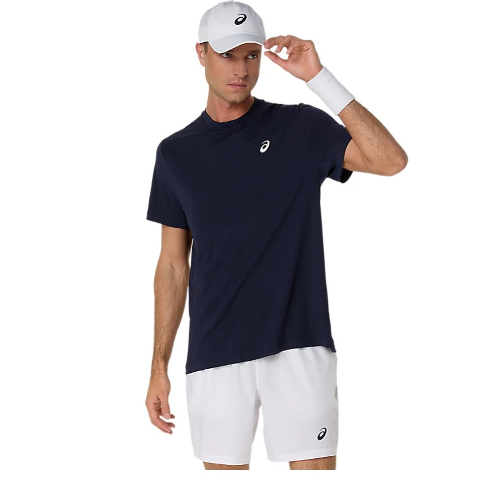 Sleek navy Asics style. The COURT SHORT SLEEVE TOP features a classic design that's timeless for a variety of matches and practices.