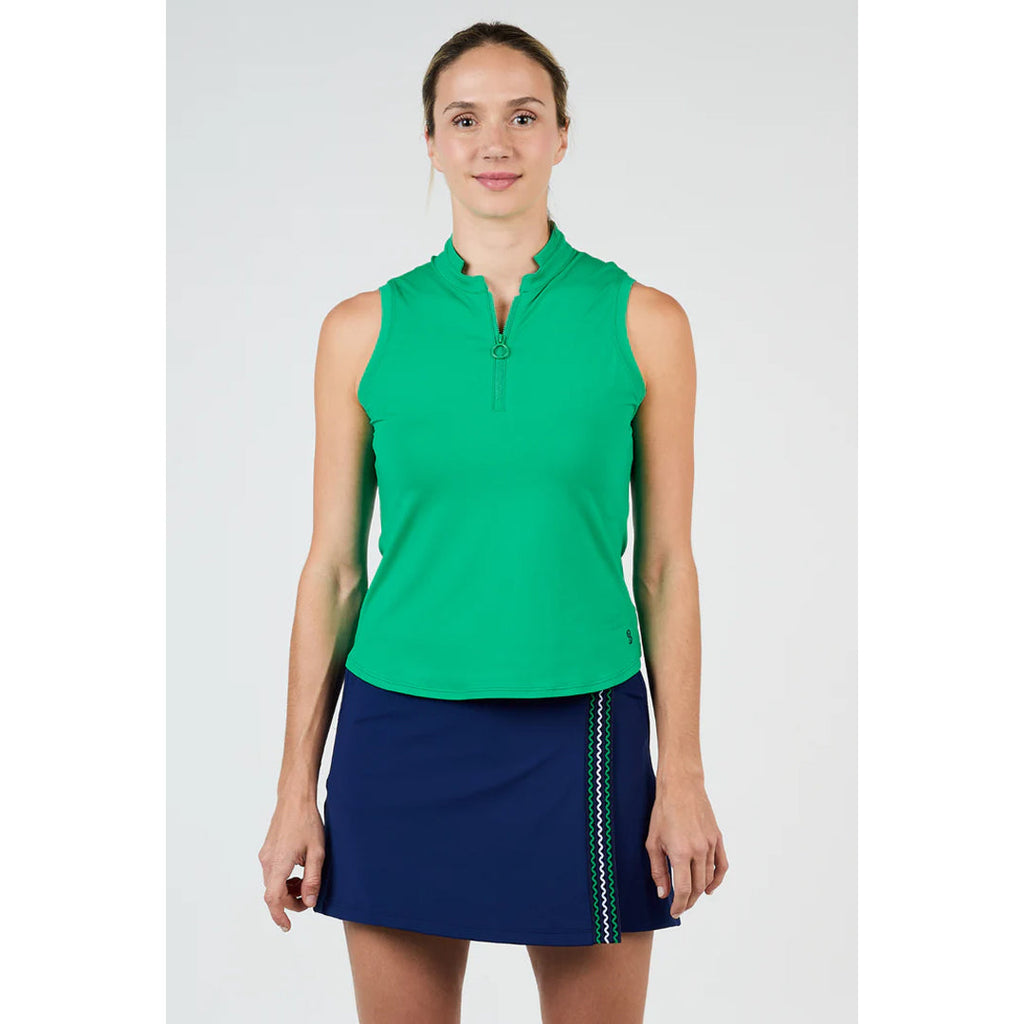 Stylish green top, perfect for the court. Channel your inner strength in the Green Spirit Zen Top — where performance meets intuitive style. Designed in a bold Zen Green hue that radiates energy and balance, this sleeveless top features a modern step collar and zip-front neckline for an elevated, sporty edge. The curved hem flatters the form while offering easy mobility for the woman who’s always on the move. Crafted with Sofibella’s signature breathable, moisture-wicking fabric, this top keeps you cool and confident from match point to lunch plans. Pair it effortlessly with Sofibella’s Wave-trimmed skorts for a complete look that embodies grace and grit.