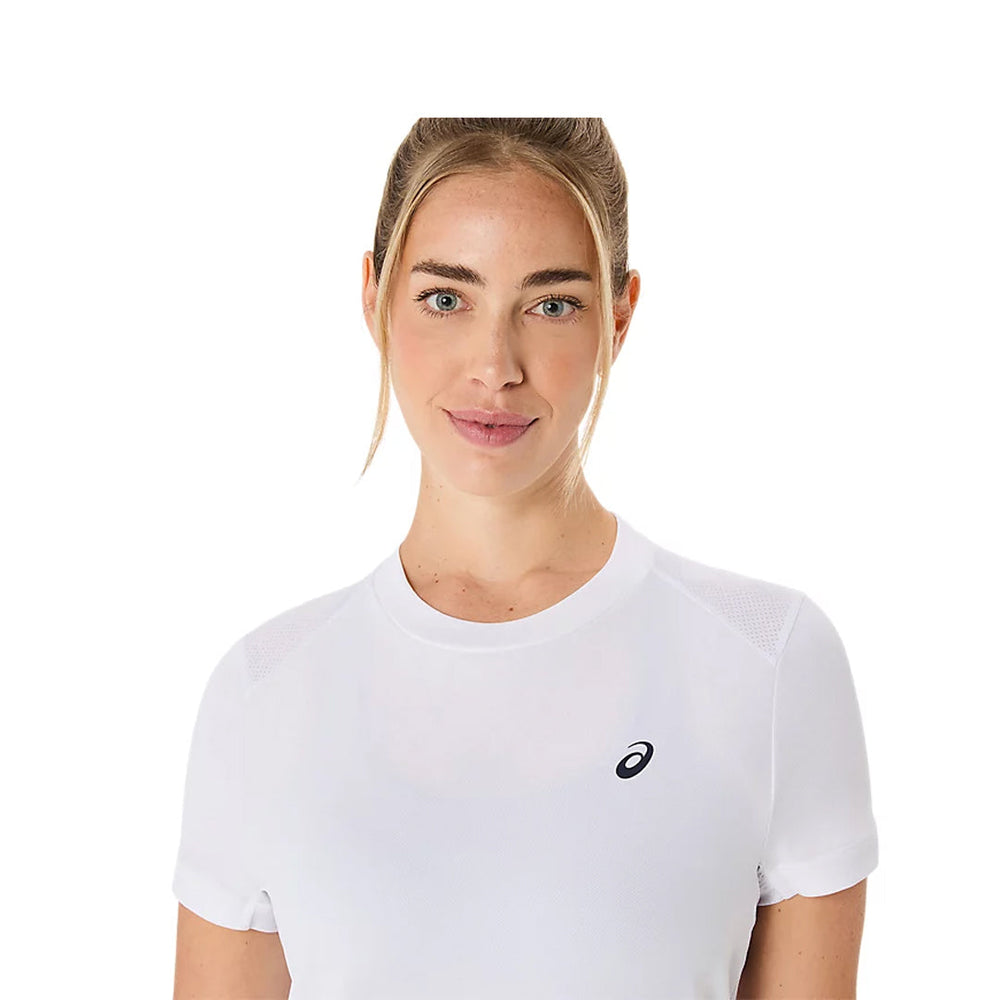 Classic white tee with amazing breathable qualities. The COURT SHORT SLEEVE TOP features a classic design that's timeless for a variety of matches and practices. It's designed with a classic tennis material and manages moisture with its dry and soft fabric for a comfortable top.