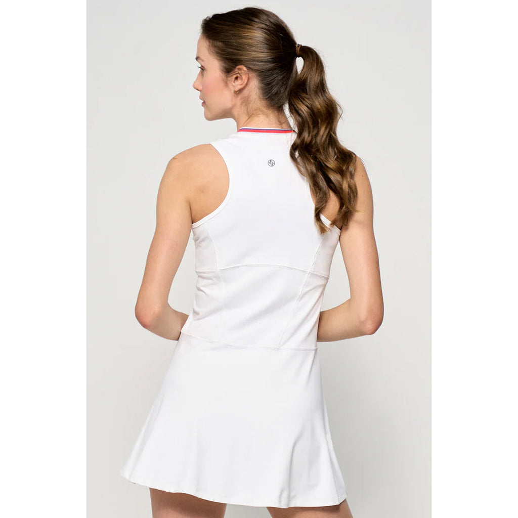 Great tennis dress for style on court. This stylish dress blends sporty accents with feminine design. It features a V-neckline with striped rib detail and princess seams at the front and back for a flattering shape. A defined waist seam and asymmetrical front skirt seam add modern structure, while extra flutter at the back brings movement and charm. The upper back is made from laser-cut perforated fabric for breathability. With a 32" length and body-skimming fit, it’s designed for both comfort and performance.
