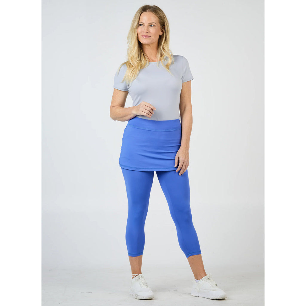 Fun valley blue in a great skapri for tennis, the gym, or any occasion. Any time is tennis time in this a-line, mid-waisted skirt, designed with a flat waistband and stretchy built-in leggings for extra coverage. Hidden ball pockets under skirt. This piece is crafted with Sofibella’s signature soft, breathable, and stretchy “Sofi-Premier” fabric.