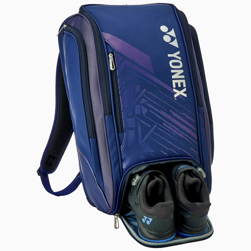 Advanced backpack in navy blue. Designed for comfort and capacity, this bag holds up to 2 racquets with a dedicated racquet compartment and a massive main compartment for gear, apparel, and more. Two large side pockets and an outer accessory pocket offer additional storage. An integrated shoe pocket keeps footwear separate, while the ventilated padded back and adjustable backpack straps with a chest clip ensure comfortable, secure carrying on the go.