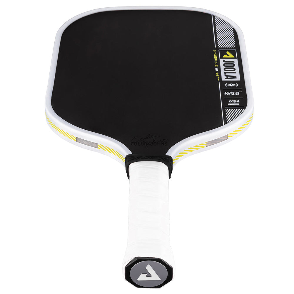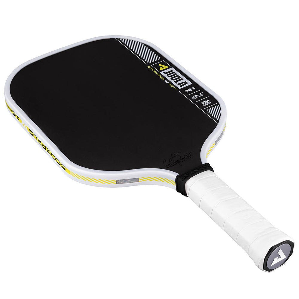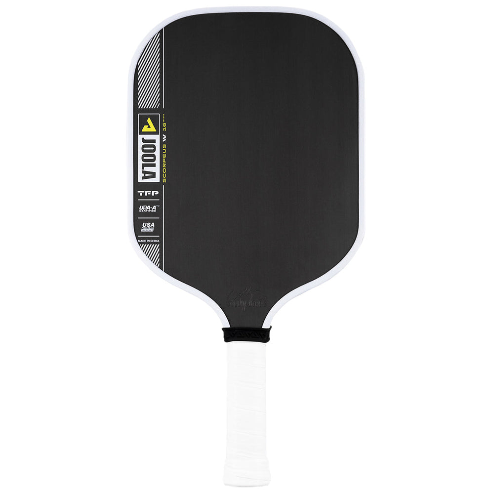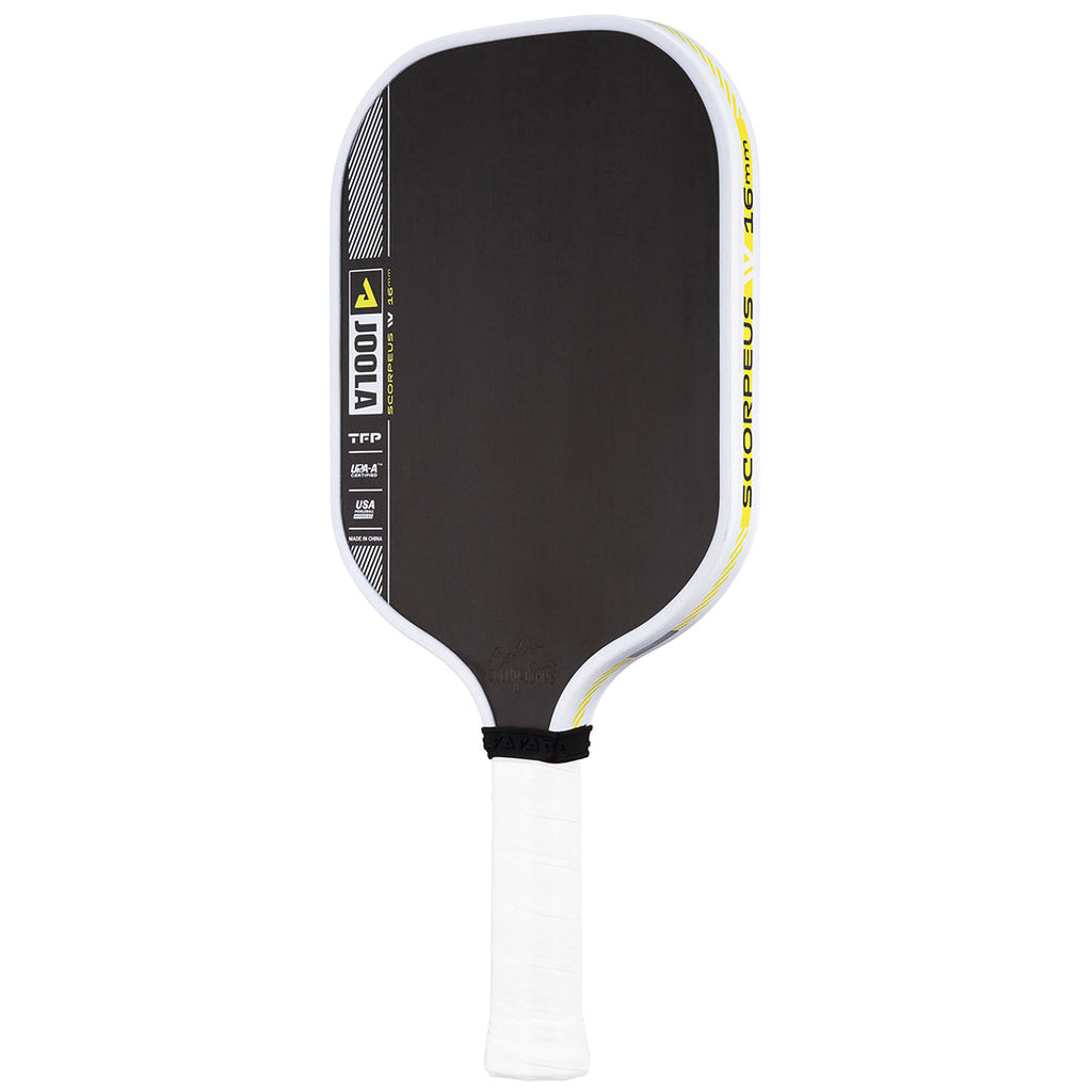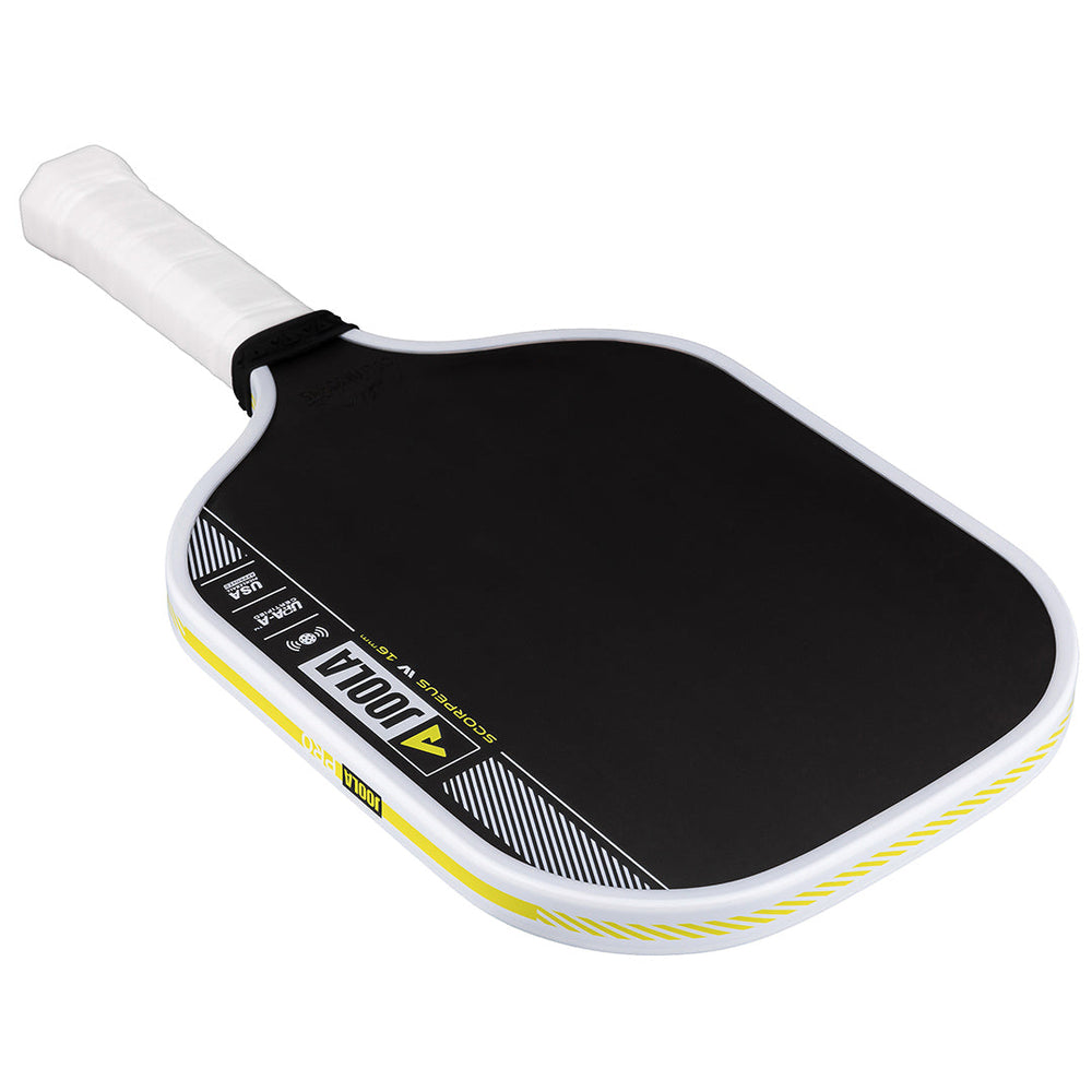 Smash and sting the opponent in 16mm width. The Scorpeus Pro IV 16mm pickleball paddle, powered by TechFlex Power (TFP) technology, delivers a new standard in balance and responsiveness. By maximizing paddle width over length, the Scorpeus Pro IV shape becomes easier to maneuver, allowing your instincts to take over during fast-paced hand battles. Advanced weight distribution throughout the paddle helps reduce fatigue and offers real-time feedback to let you adapt to the flow of the game. Building on the power and feel of JOOLA's innovative Propulsion Core, this paddle redefines consistency and performance every time you take to the court. All Pro IV paddles are USAP PBCoR 43 certified and UPA-A pro certified.