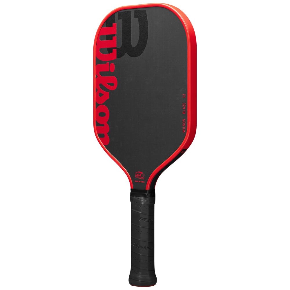Precision is the name if winning is your game. Maximize power while maintaining control on the pickleball court. Wilson's Blaze 13 Pickleball Paddle is ideal for competitive intermediate to advanced players who can place the ball with precision and are looking to add some power to their shots. The elongated shape contains a more concentrated sweet spot with great responsiveness, and its extended handle length is ideal for players who hit with two-handed backhands. The hybrid face features raw carbon fiber with a fiberglass base, resulting in maximum power coupled with enhanced spin.
