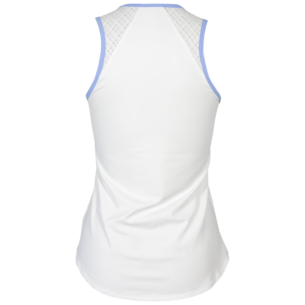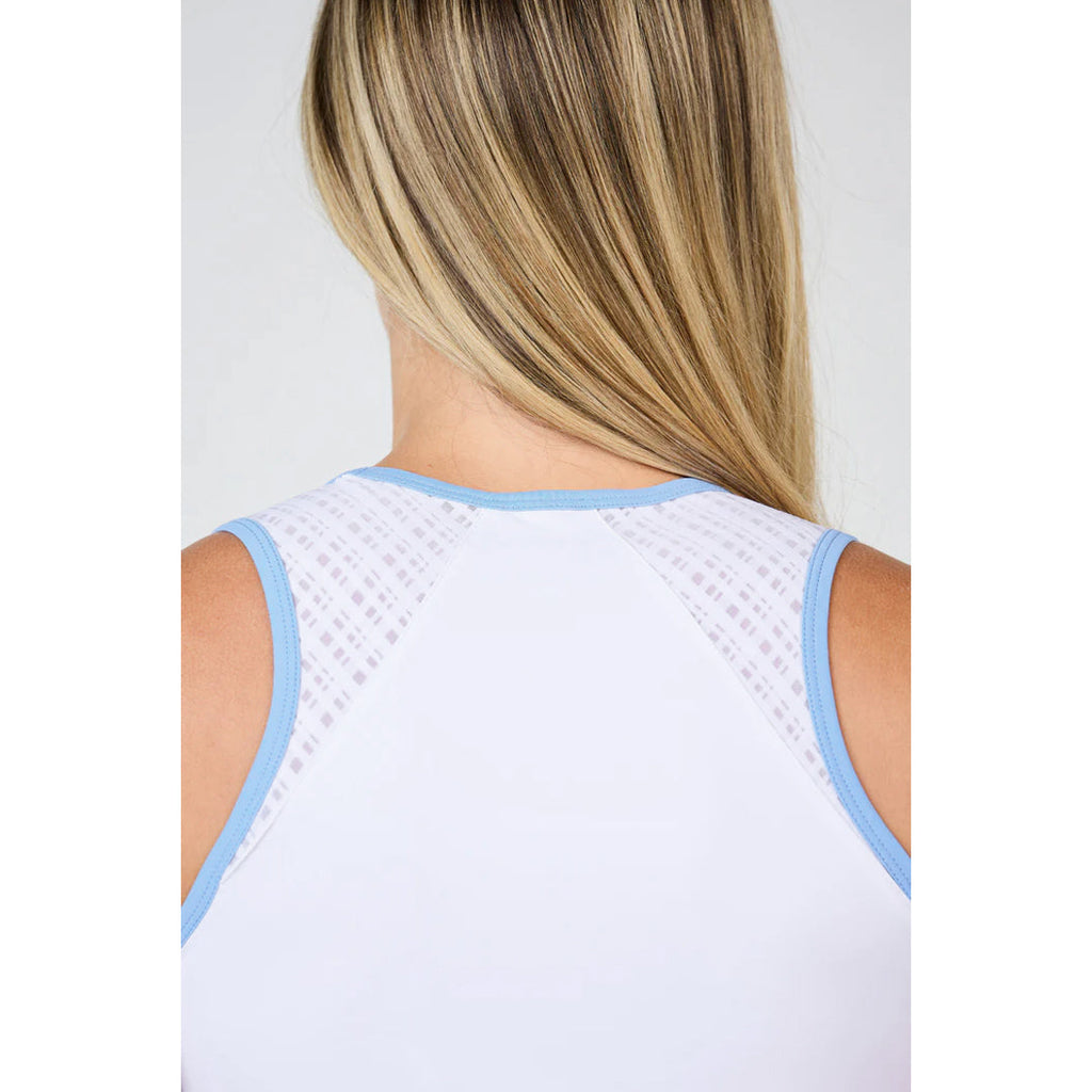 Lightweight tank perfect for tennis. Inspired by the crisp energy of early tides and the fresh tones of spring, the Spring Tide White Racerback Tennis Top brings effortless style and performance to the court. Designed in clean white with subtle sophistication, this top features a low crew neckline, a flattering curved hem, and a sporty racerback silhouette for full range of motion. Delicate periwinkle blue trims add a soft pop of color, while a white on white grid jacquard mesh insert along the raglan-cut back panel enhances breathability and moves beautifully with you. Lightweight yet structured, this white racerback tennis top is made to flow seamlessly from high-intensity play to relaxed post-match moments. Crafted with Sofibella’s premium performance fabric, it offers UV protection (50+ UPF), four-way stretch, moisture-wicking, quick-drying, and pilling-resistant properties—keeping you cool, comfortable, and court-ready all day long.