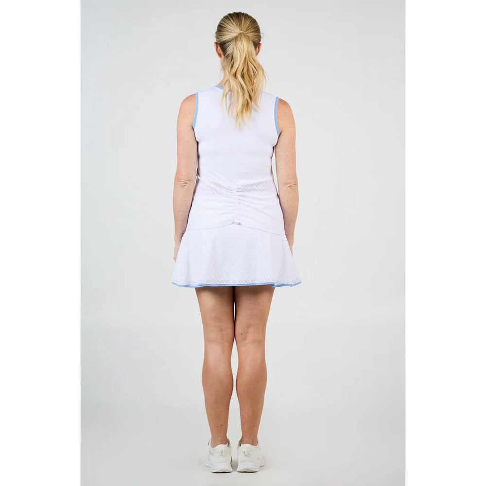 Elegant design with sophisticated Sofibella style. Designed with graceful movement and thoughtful detail, the Spring Tide Women's Sleeveless White Tennis Top brings a fresh, modern edge to your on-court look. Trimmed in soft periwinkle blue, this white top features a flattering silhouette with a touch of functional elegance. A grid jacquard mesh insert at the shoulders adds breathable texture, while the back showcases an adjustable drawstring with a toggle—allowing you to create a custom ruched effect from the waist down through the semi-sheer white-on-white jacquard mesh panel. This detail flatters the shape and offers dynamic ventilation and style. Crafted with Sofibella’s premium performance fabric, this women's white sleeveless tennis top offers UV protection (50+ UPF), four-way stretch, moisture-wicking, quick-drying, and pilling-resistant properties—keeping you cool, comfortable, and ready for every rally.