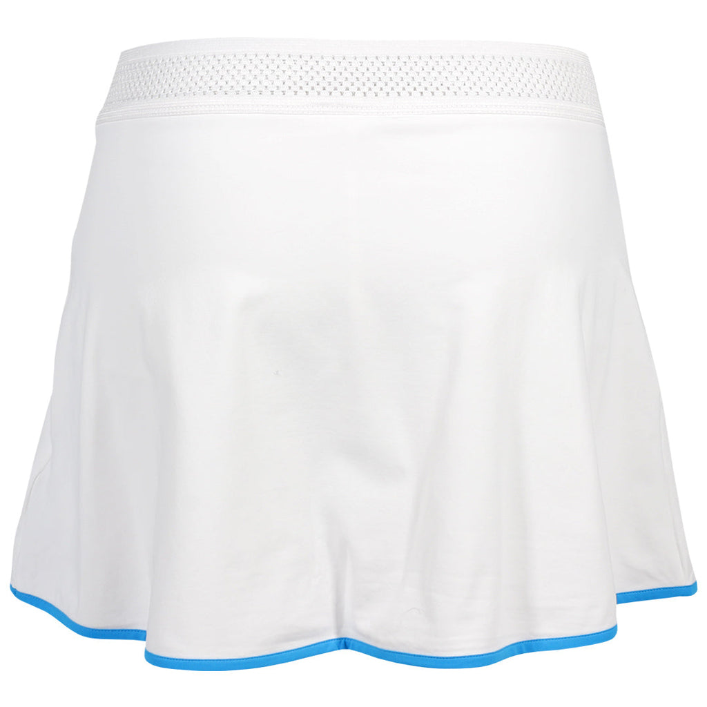 Fluttery and sporty skort in white and blue. This women’s tennis skirt combines performance and feminine style with a dynamic blue bottom hem. Designed for comfort and confidence on the court, it features built-in shorties for secure coverage and ease of play. The lightweight, flattering silhouette allows for unrestricted movement while maintaining a polished, sporty look—perfect for match play or practice.