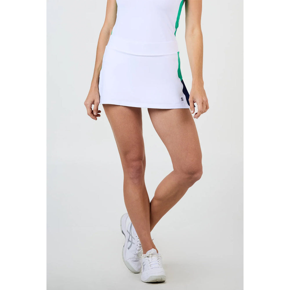 Flity and cute skort to look great on court. Minimalist in form, mindful in function—the Green Spirit 13" Tennis Skort is a fresh interpretation of a court essential. Designed in crisp white with sleek Zen and Navy geometric insets at the sides, this skort brings a quiet boldness to your tennis wardrobe, inspired by the balance of motion and mindfulness. The flat waistband offers a smooth, supportive fit that stays in place through every match, while the slightly flared A-line silhouette adds a touch of femininity without compromising performance. Built-in white shorties provide breathable coverage, so you can move with ease, focus, and confidence. Crafted with Sofibella’s premium performance fabric, this skort delivers 50+ UPF sun protection, four-way stretch, moisture-wicking, quick-drying properties, and resistance to pilling—ensuring comfort and polish from first serve to last set.