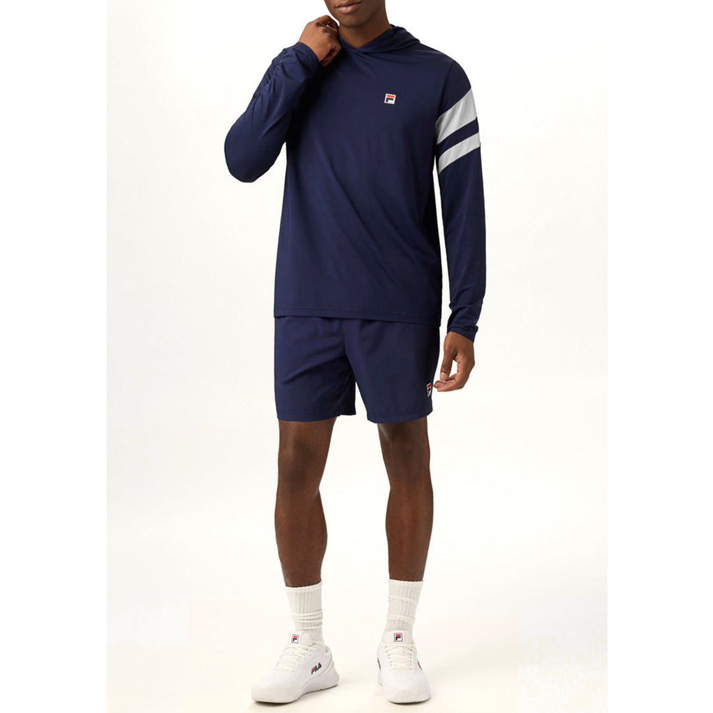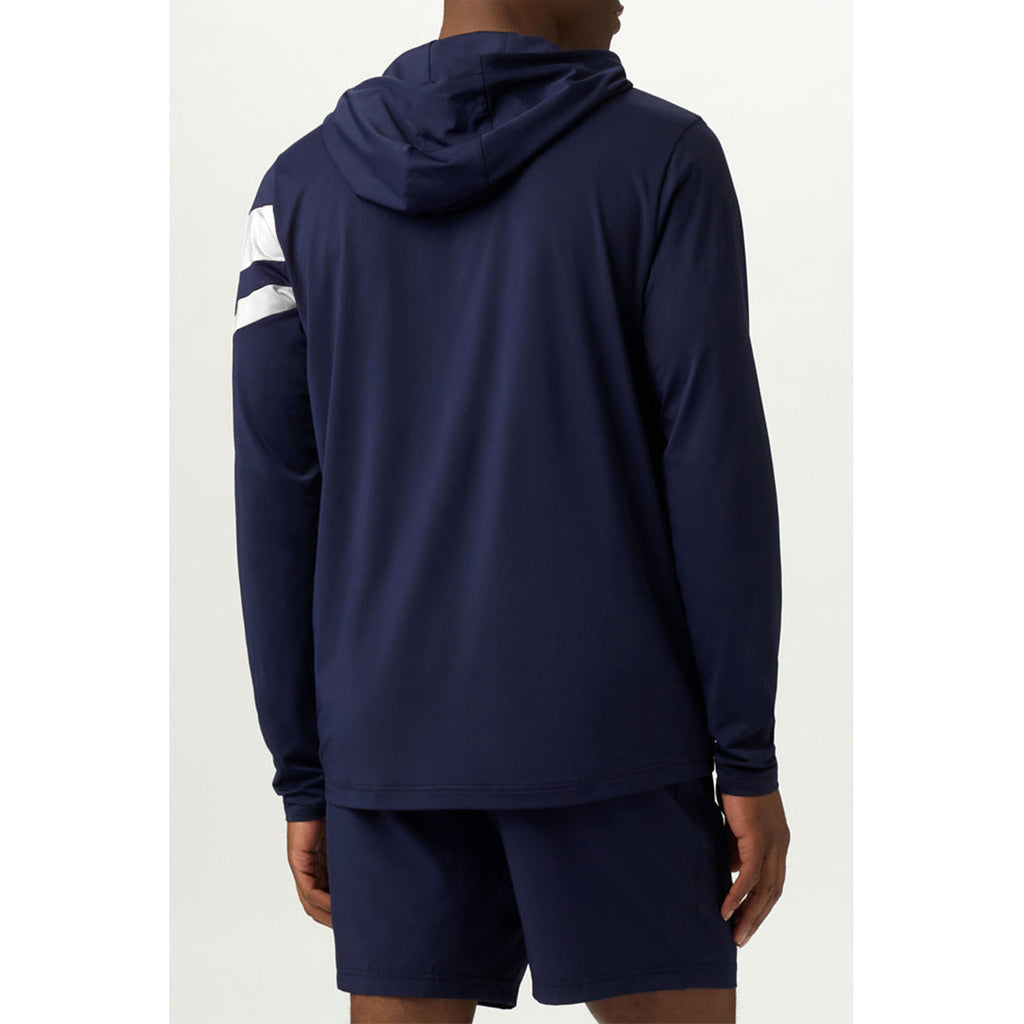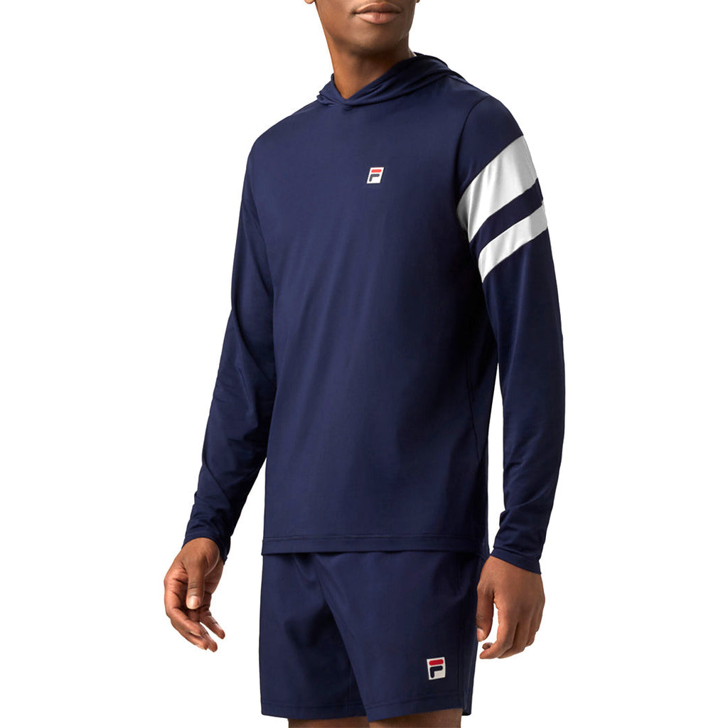 Comfortable and warm hoodie in fila navy and white. Layer up on those cooler days and get out there. When the temps and conditions switch it up, so can you, thanks to this lightweight hoodie. Featuring striped shoulder details, 50+ UV protection, plus, it's made with anti-odor and sweat-wicking materials so you can play on and not sweat the small stuff.