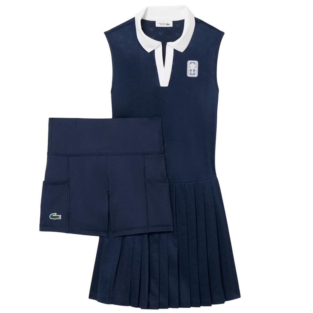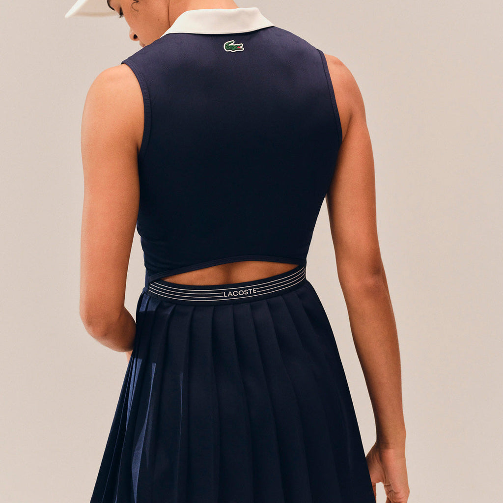 In classic Navy, this dress is both elegant and made for the court. This dress, worn by Lacoste players at the London tournament, is the fruit of years of elegant sportswear design expertise. Made from stretch jersey for comfort, with subtle lacy motifs plus Ultra Dry and anti-odor technology. A sophisticated, feminine take on a technical style, featuring a polo collar and pleated skirt.