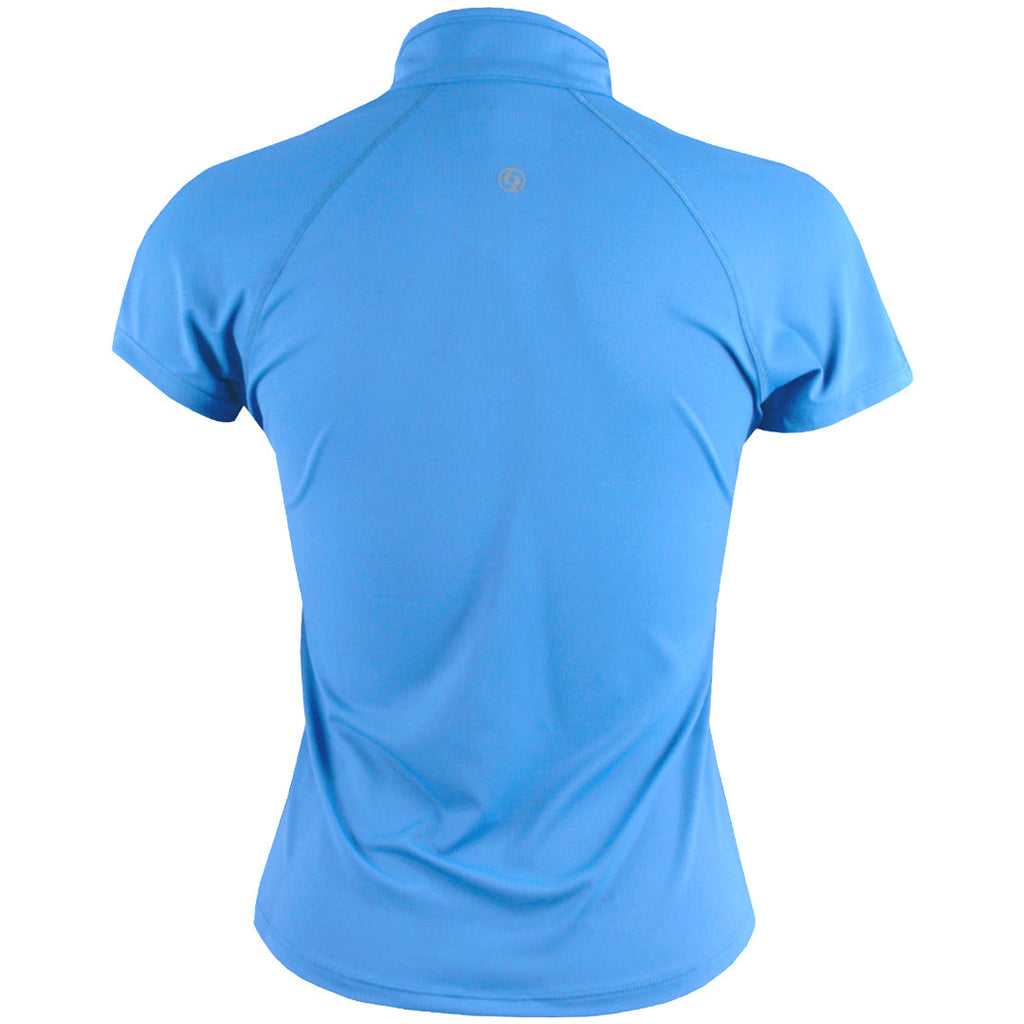 Stylish and flattering top in blue sky. This sleek and versatile top features a modern mock neck with a 9" tonal zipper for adjustable coverage and style. Designed with raglan sleeves for enhanced mobility, it offers a comfortable yet flattering body-skimming fit. The curved hem adds a subtle, stylish touch, while the 22.5" length makes it perfect for layering or wearing on its own. Ideal for both active and casual wear. Made with Lija's UPF 50+ material.