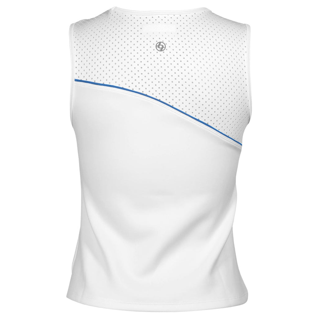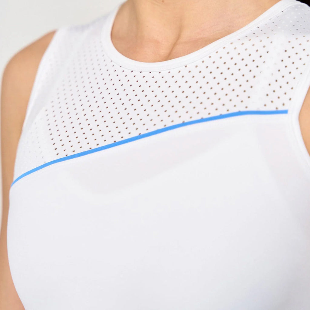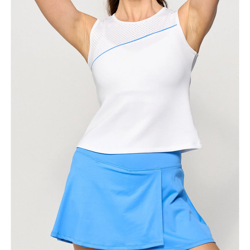 Stylish white top with blue sky for style on court. This top features a classic crew neckline and an asymmetrical seam with contrast piping across the upper bust and back for a modern, sporty touch. The upper body is crafted from laser-cut perforated fabric for enhanced breathability, while the 20" length and body-skimming fit create a sleek, flattering silhouette.