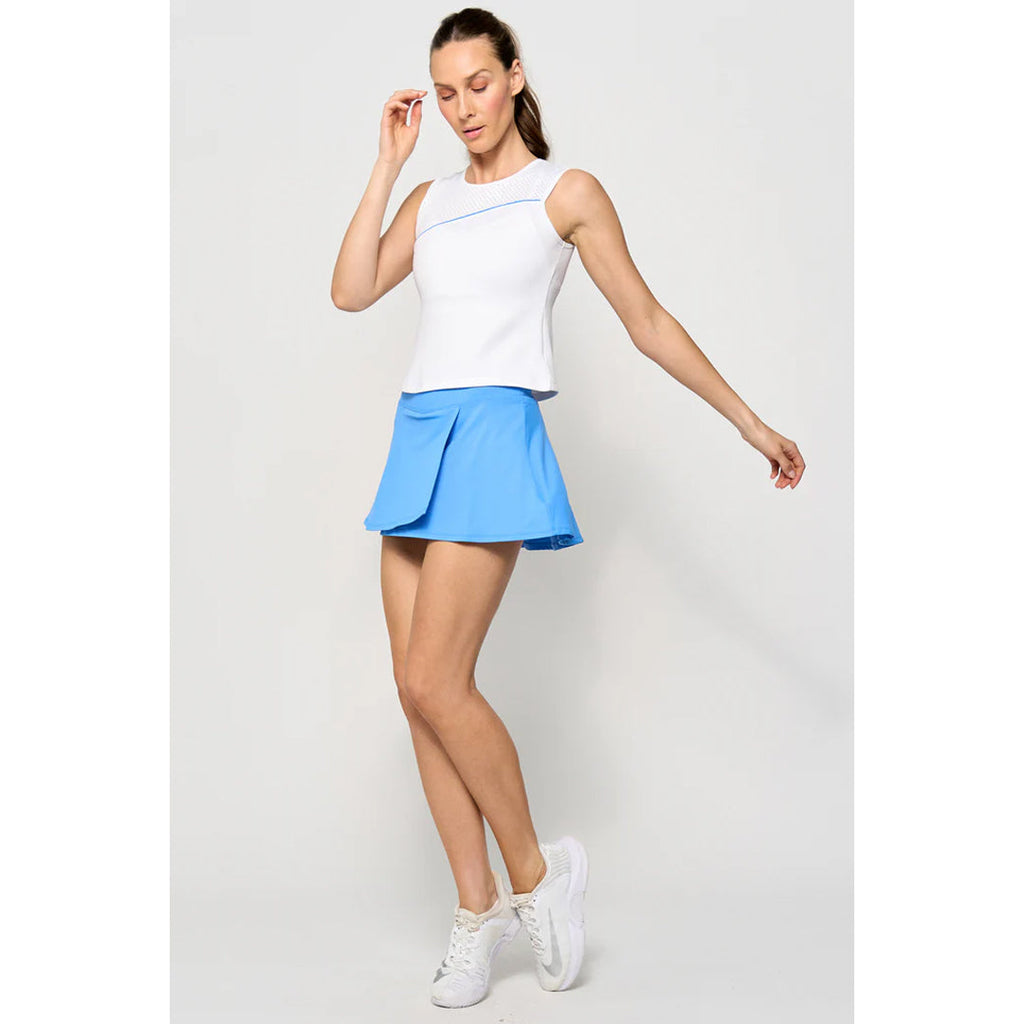 Sporty style with a great fit, in blue sky. This skirt features a wrap-style silhouette with a vertical front opening on the left side, angled slightly from the hemline for a flattering touch. Its fluttery shape creates movement all around, while the 3" waistband and 13" length offer a secure, comfortable fit. Designed to skim the body, it delivers a sleek, feminine look perfect for active or casual wear.