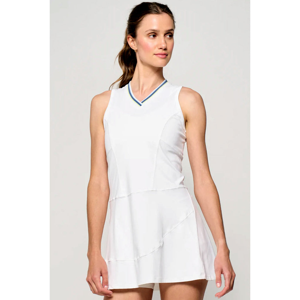 Elegant tennis dress for sporty style on court. This dress features a V-neckline with striped rib detail and princess seams at the front and back for a flattering, contoured shape. A defined waist seam and asymmetrical front skirt seam add a modern touch, while extra flutter at the back creates graceful movement. The upper back is crafted with laser-cut perforated fabric for breathability, and the 32" length with a body-skimming fit delivers a sleek, feminine silhouette.