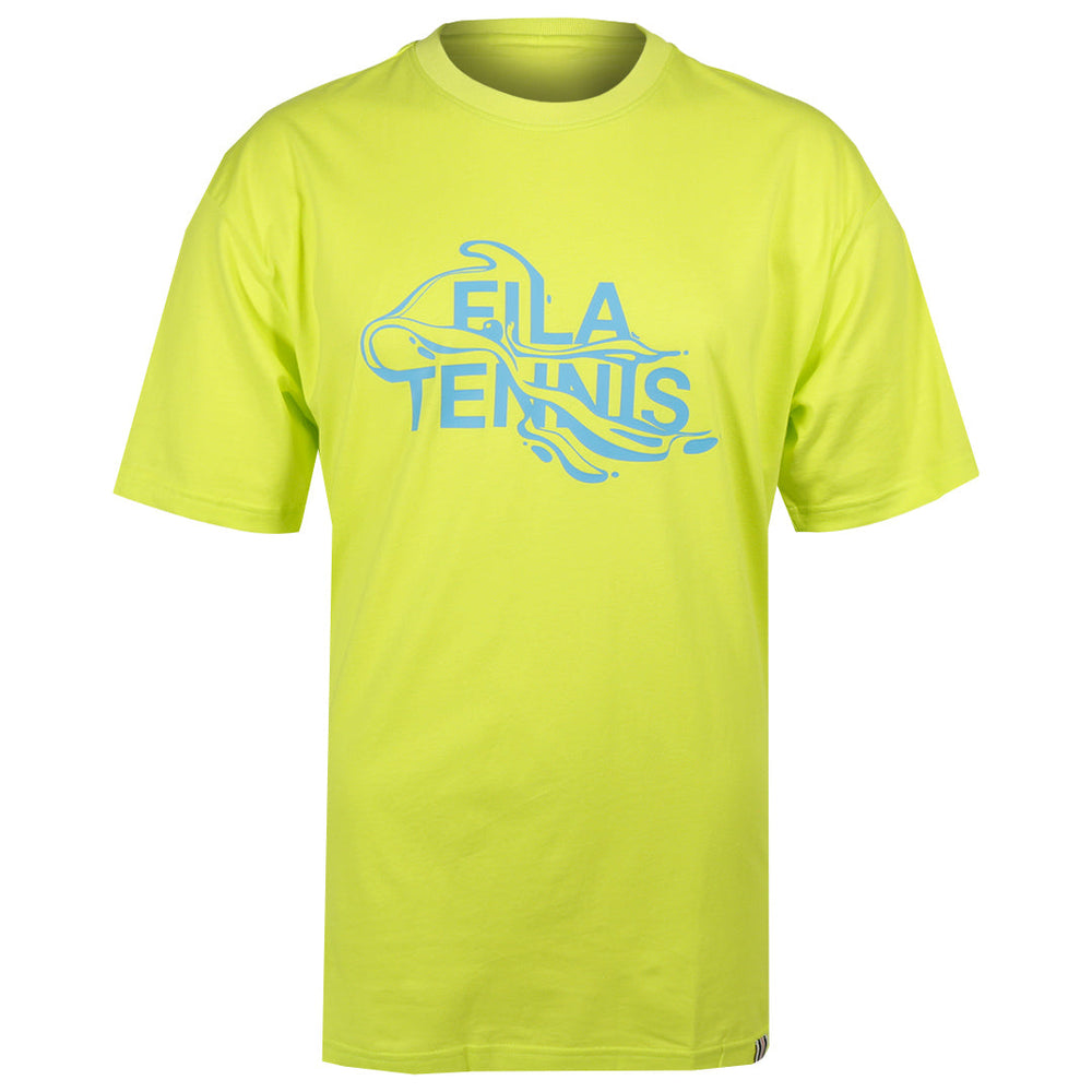 Fun neon yellow tee with stylized blue lettering makes for a terrific tennis shirt. In 100% pure cotton material, the tee fits and sits nicely on the skin, especially when sweating it remains soft. This is a great addition to any tennis wardrobe!