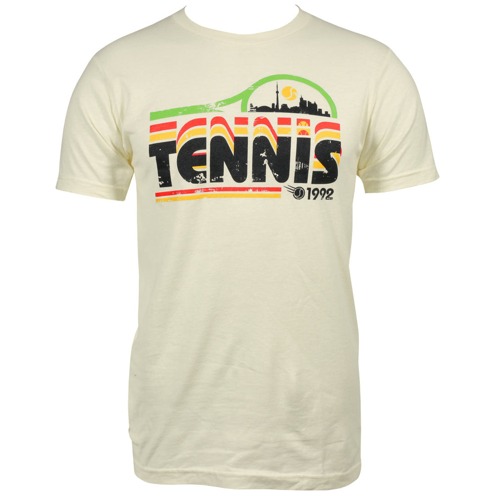 Stylish Toronto tennis themed t shirt with a retro feel. Crafted from 100% ringspun cotton, this garment features a fine knit jersey with 30 singles for a soft, durable feel. The Heather Grey option is a blend of 90% cotton and 10% polyester, while the Heather Colours consist of a 50/50 cotton/polyester mix. It undergoes reactive dyeing for long-lasting color vibrancy. The design includes a ribbed crew neck with taped shoulders, along with double-needle stitching on both the sleeves and bottom hem. With its tubular construction, this product offers a comfortable fit and is USMCA Certified.