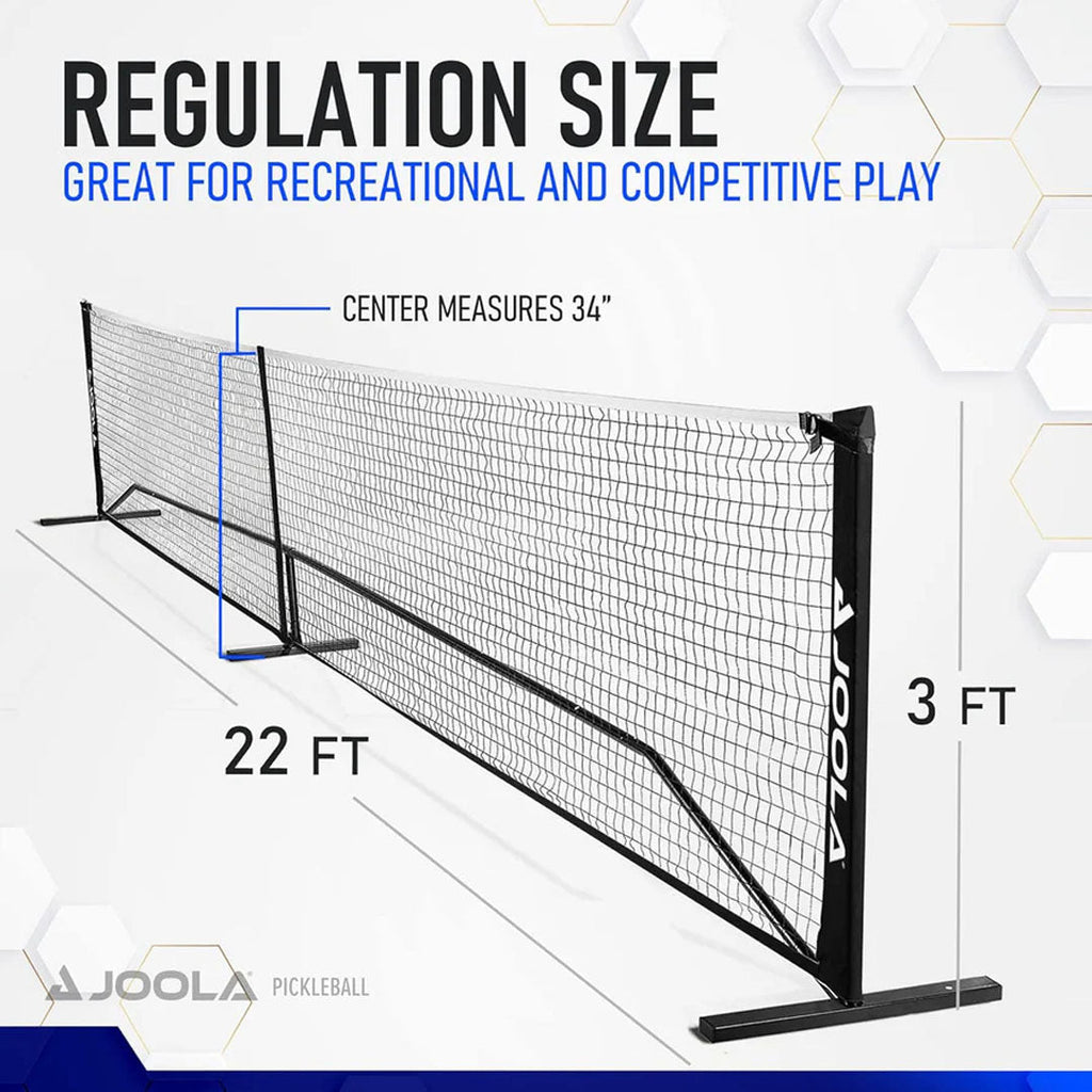When pickleball calls, you answer. Make your own pickleball court wherever you go with the JOOLA Elemental Pickleball Net. This easy to transport system is the regulation height of 36in and USAPA recommended length of 22ft. The 22 foot length provides an additional 12 inches on both sides for extra net coverage. Made with durability in mind, the net features nylon fabric and knotless PPVC netting. The wide, bent interlock steel legs provide increased stability. Set up and break down in just minutes. The reinforced carrying bag makes this setup incredibly easy to transport.