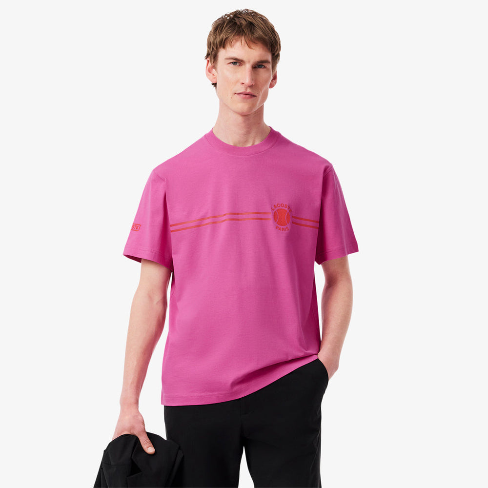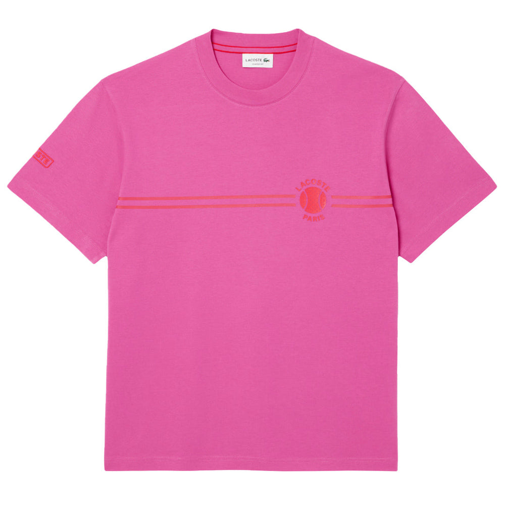 Cool pink colour on this sporty shirt. This T-shirt is the fruit of 90 years of Lacoste fashion and sportswear expertise. This cotton jersey piece features a tennis heritage print and contrast stripes for signature style. A sporty piece finished with sophisticated details, including a Lacoste print on sleeve.