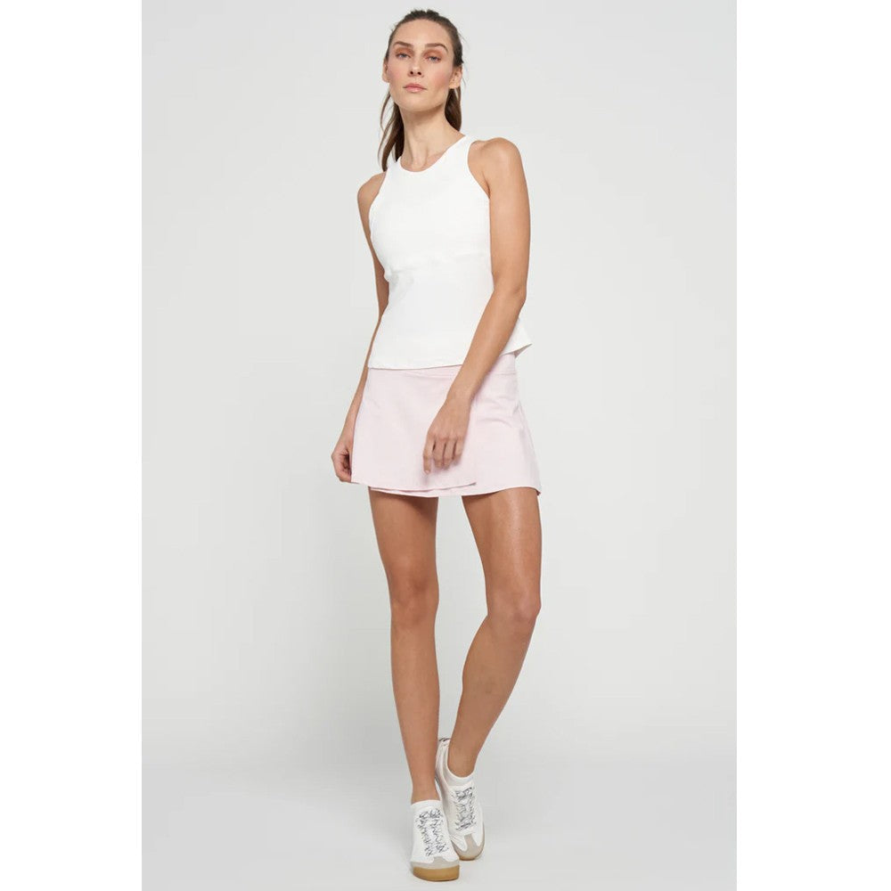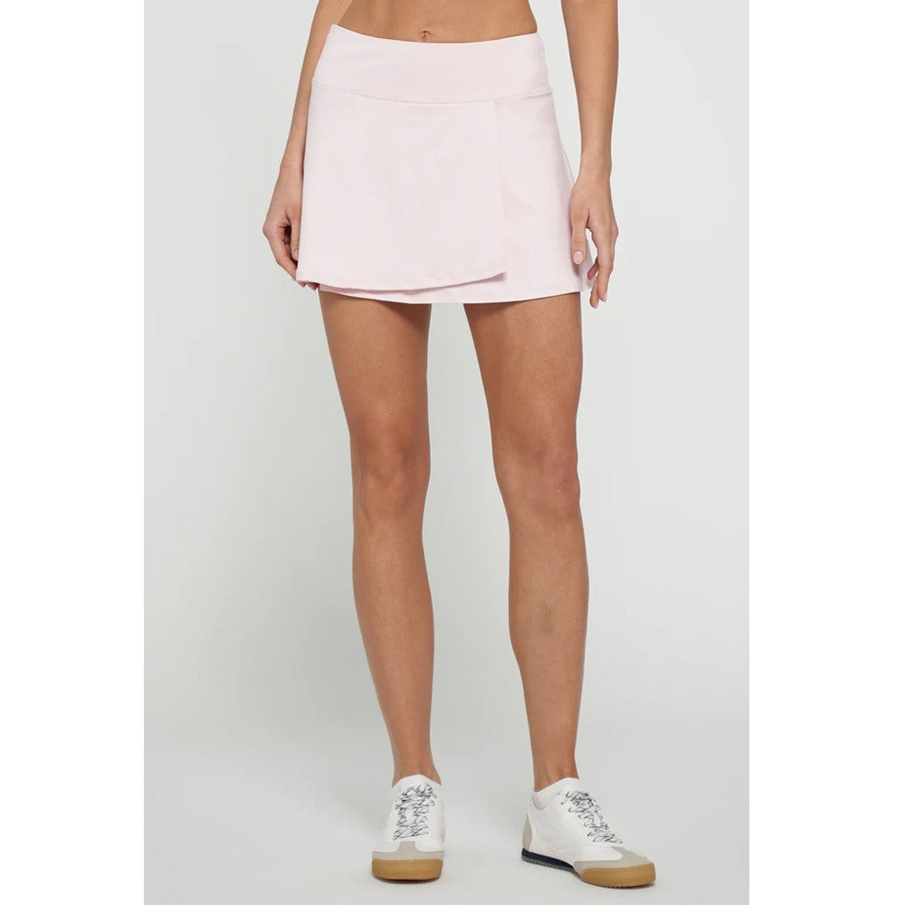 Cute pink skirt with a unique wrap design. This elegant skort features a wrap-style silhouette with a vertical front opening on the left side, angled slightly from the hemline for a modern touch. Designed with a fluttery shape all around, it moves effortlessly with you. A 3-inch waistband provides a comfortable and secure fit, while the 13-inch length offers a flattering look. With its body-skimming fit, this skort blends style and ease for any occasion.