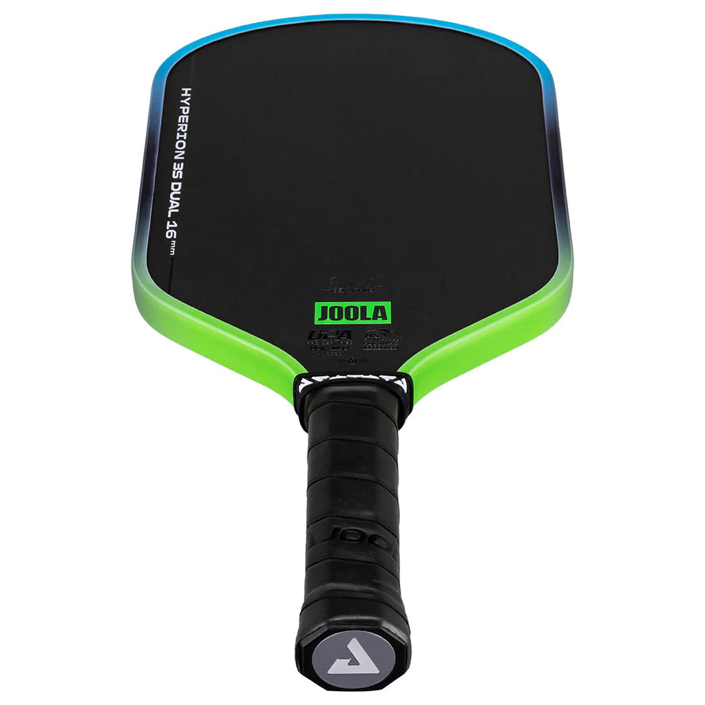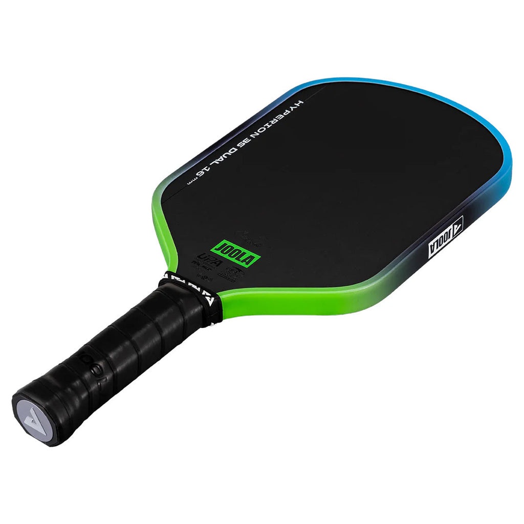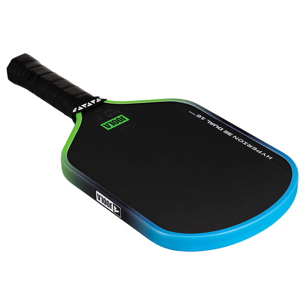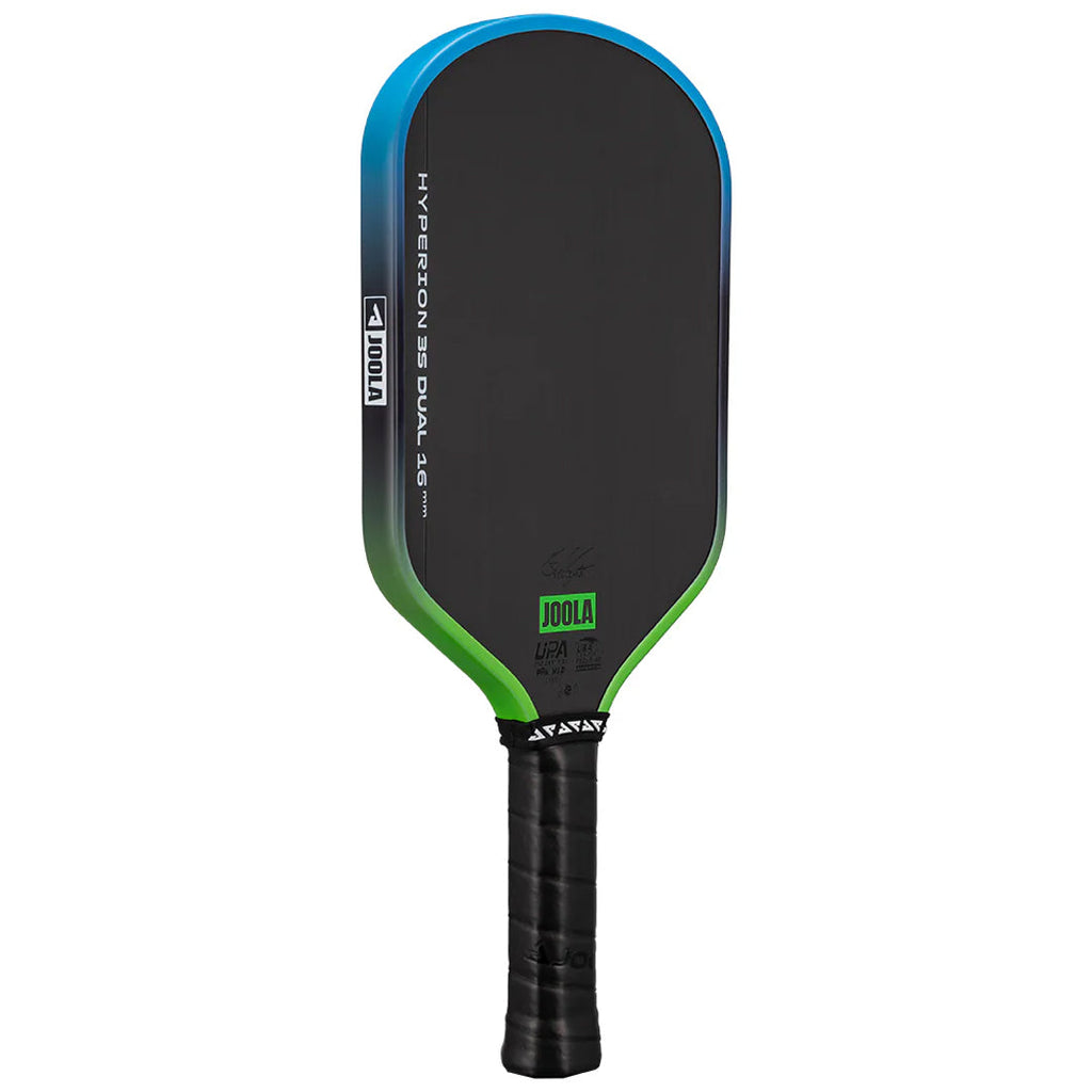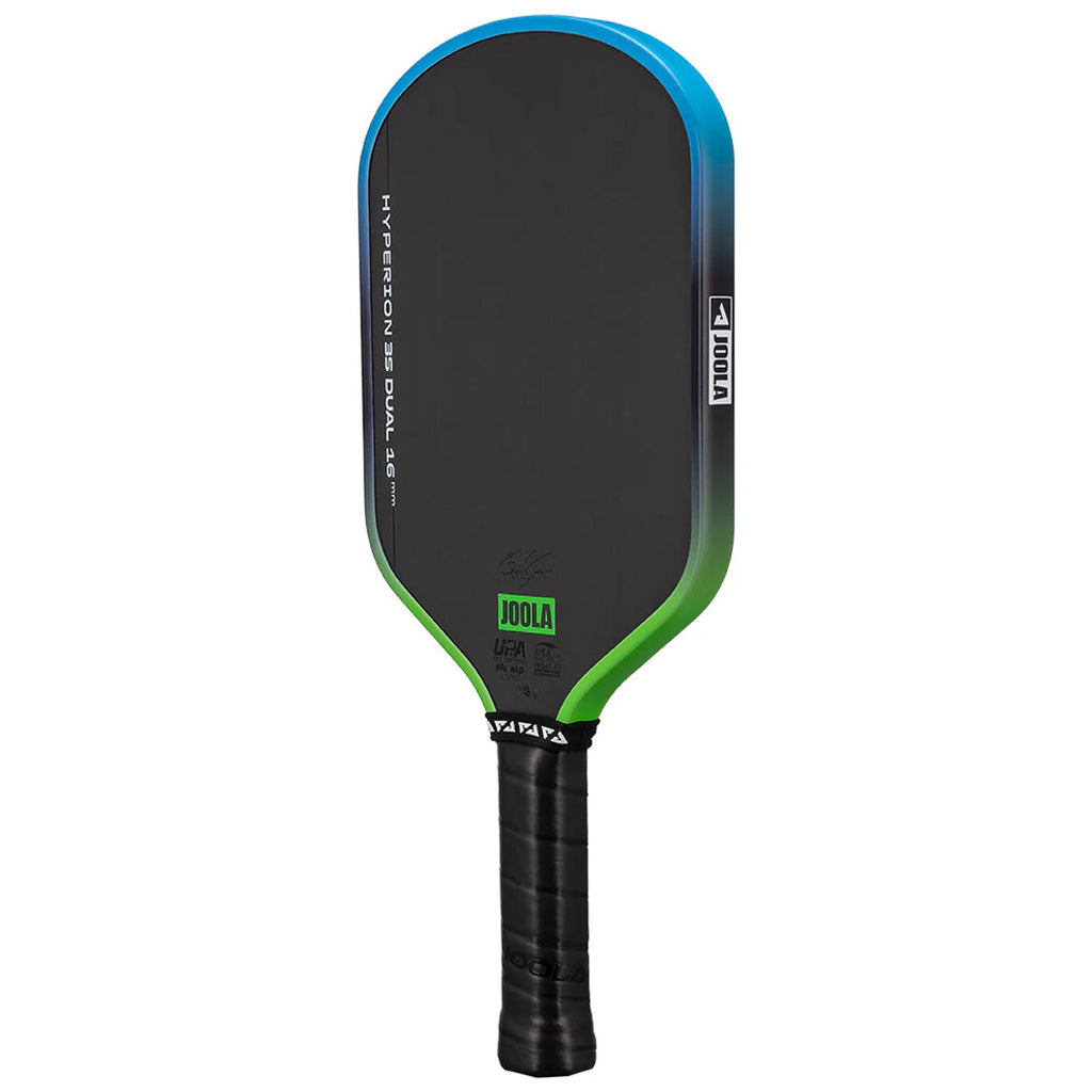 The Hyperion 3S Dual is finished with a distinctive blue and green dual-color gradient along the edge guard, bringing updated performance and a signature JOOLA look to this proven paddle shape.