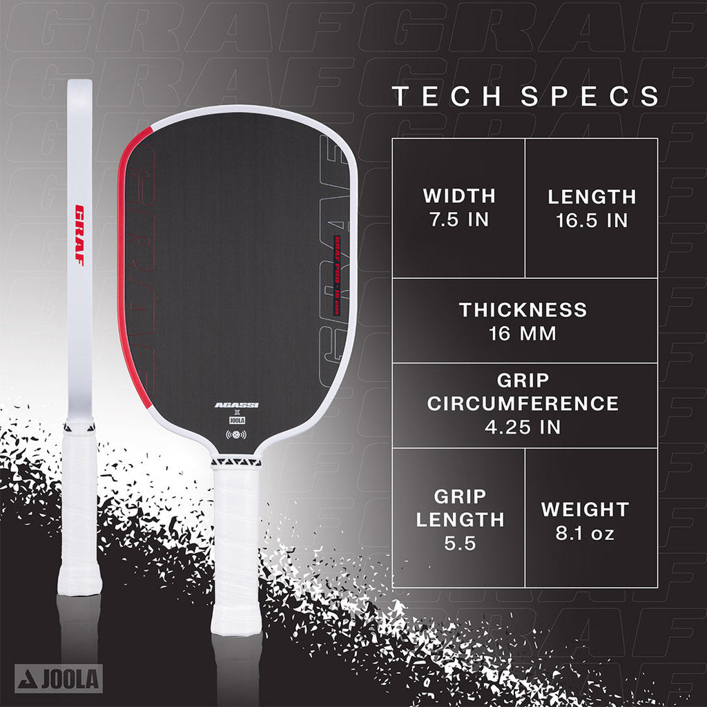 An elite racquet for the toughest players. Play with confidence and purpose with the JOOLA Graf Pro. Designed for players who have a pro mentality, the Graf Shape extends the sweet spot to the outer edges and bottom corners, allowing you to place pin-point accurate shots just out of the reach of your opponent. Just below the surface, Graf Pro features Tech Flex Power (TFP) technology to help evenly distribute weight throughout for smooth handling and forgiveness on every swing. Let the paddle do the work and you can handle the rest. Make the Graf Pro yours.