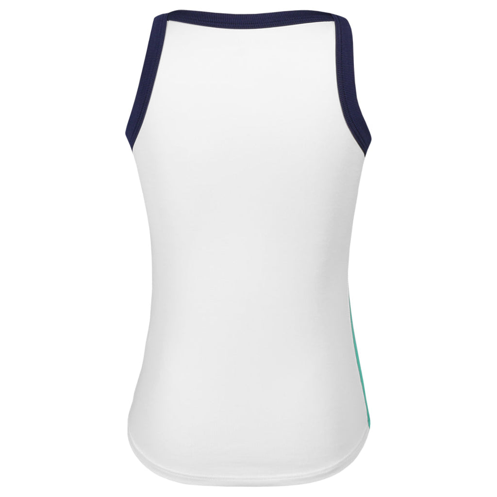 Fun mix of colours that girls will love on court. Designed for young athletes who lead with confidence and energy, the Green Spirit Girls’ Racerback Tank brings style and performance to the court. Made with Sofibella’s lightweight, moisture-wicking Sofi-Premier fabric, this tennis tank keeps her cool and comfortable through every match and practice. The soft rib Navy trim adds a fun contrast to the fresh White body, while Zen Green wave-print side panels add a playful pop of movement. With a built-in racerback and a no-fuss fit, this tank is made to move with her — whether she’s serving up points or just having fun.