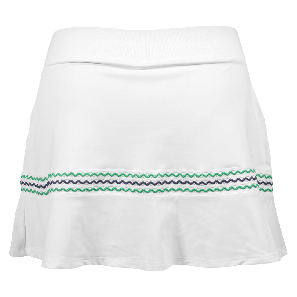 Fun skort with a sporty style. The Green Spirit Girls’ Ruffled Tennis Skort blends simple style with sporty energy. Available in crisp White, this skort features a clean design with no side slits and a wide, flat waistband for a comfy, supportive fit that stays in place during every game. A signature wavy trim in Zen Green, Navy, and White follows the skirt’s lines, adding a fun touch of movement and balance. Built-in shorties in matching colors provide extra coverage, so she can play freely and confidently on the court.