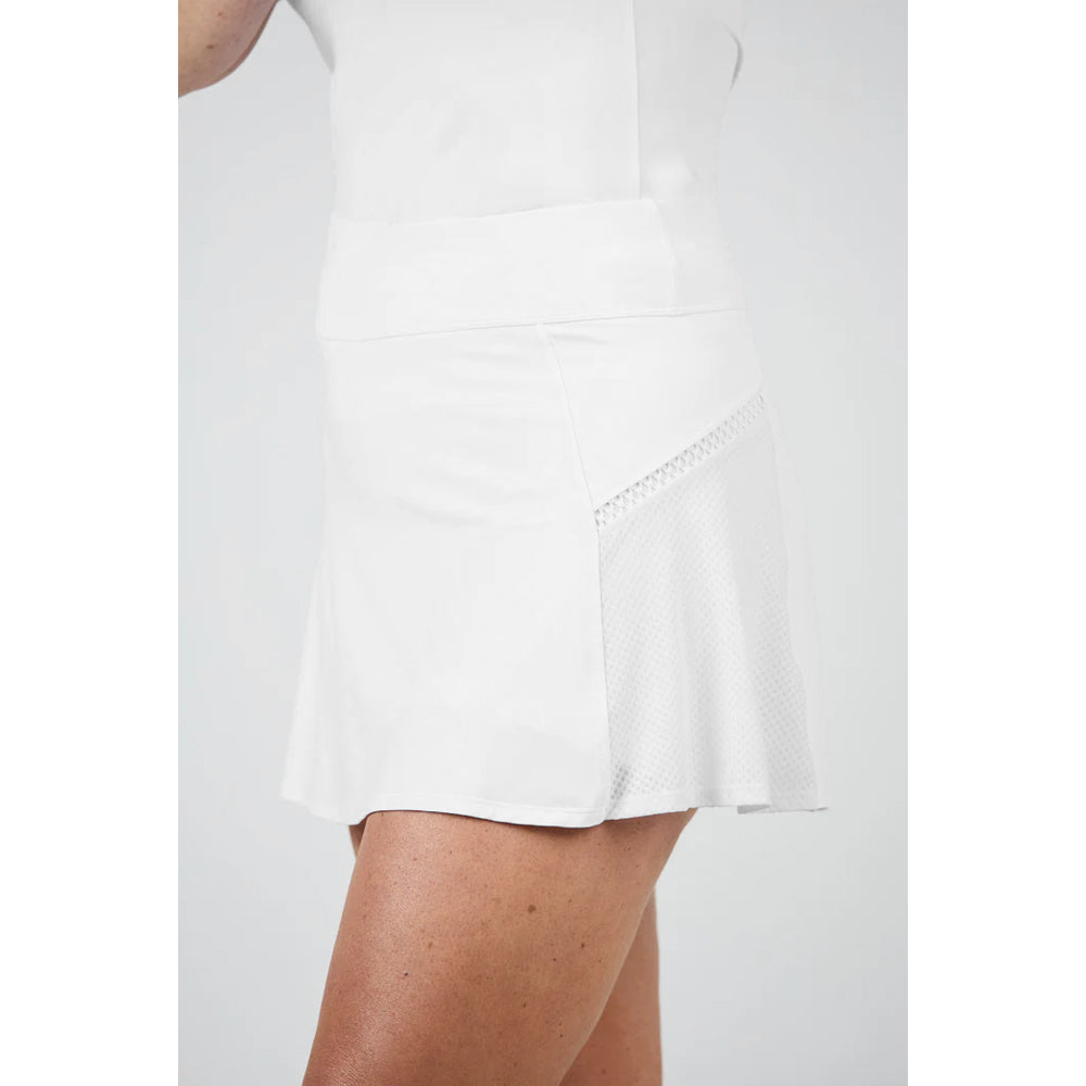 Play your hardest and out maneuver your opponent. Effortlessly refined and thoughtfully constructed, the Trés Blanc Angled Flounce Tennis Skort brings elegance to every movement. This subtly flared silhouette features a flat front and an angled back flounce, crafted in a delicate white-on-white Magic Mesh with a see-through plaid effect. The flounce is framed with lined Trellis Trim, adding a touch of texture and visual interest from behind. Designed with a no-show flat waistband, this white tennis skort offers a clean look—especially when paired with an untucked top. Built-in white shorties provide added comfort and coverage, allowing you to move confidently on and off the court. Crafted with Sofibella’s premium performance fabric, this skort offers UV protection (50+ UPF), four-way stretch, moisture-wicking, quick-drying, and pilling-resistant properties. Lightweight, breathable, and effortlessly stylish, it’s a standout staple in the Trés Blanc tennis collection.