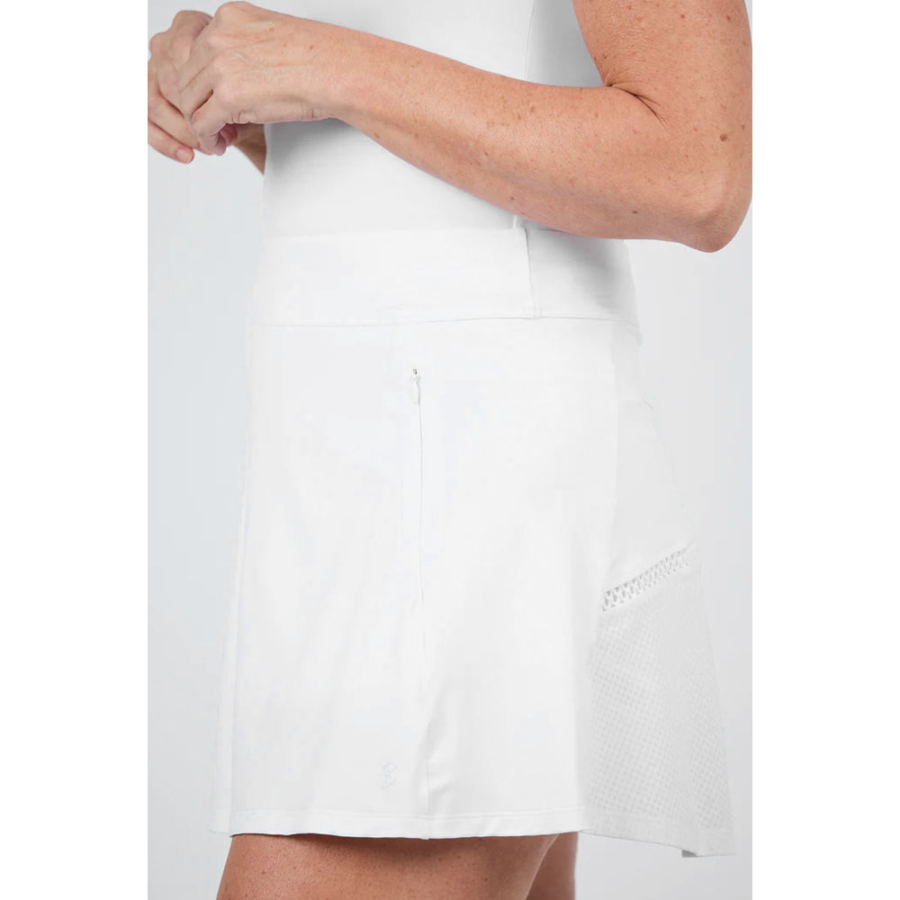 Sport elegance that will boost your on court style. Clean and confident, the Trés Blanc A-Line Tennis Skort blends performance and polish in a design made for movement. Crafted in crisp white, this skort features a sleek A-line silhouette that offers freedom and flow on the court or at leisure. A wide, flat waistband ensures a secure and flattering fit, while built-in white shorties provide all-day coverage and comfort. Thoughtful functionality meets refined detail with front zip pockets for small essentials and a back slit pocket for added convenience. At the back, a delicate Trellis Trim flounce in Magic Mesh adds light texture and a touch of sophistication—elevating this skort from sporty basic to standout essential. Made from Sofibella’s premium Sofi Premier fabric, it offers UV Protection (50+ UPF), moisture-wicking, quick-drying, four-way stretch, and pilling resistance—ensuring long-lasting performance and comfort through every match and practice Whether you're serving aces or heading to brunch, the Trés Blanc White Tennis Skort brings a sense of modern elegance to your active wardrobe.