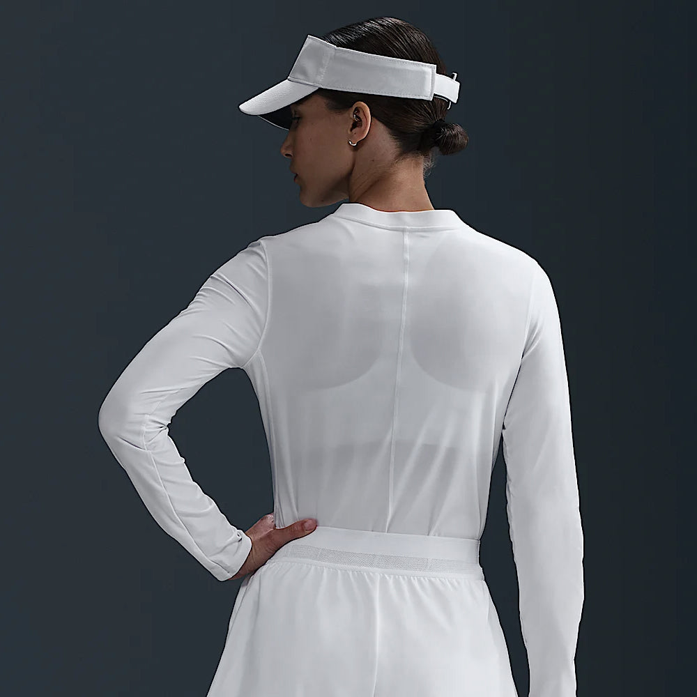 A great warm up layer in classic white. Lightweight and stretchy, this quick-drying top helps you stay cool and comfortable while you run the court. A mock-neck collar and a slim fit help reduce distractions so you can keep your head in the game. Nike Dri-FIT technology moves sweat away from your skin for quicker evaporation, helping you stay dry and comfortable.