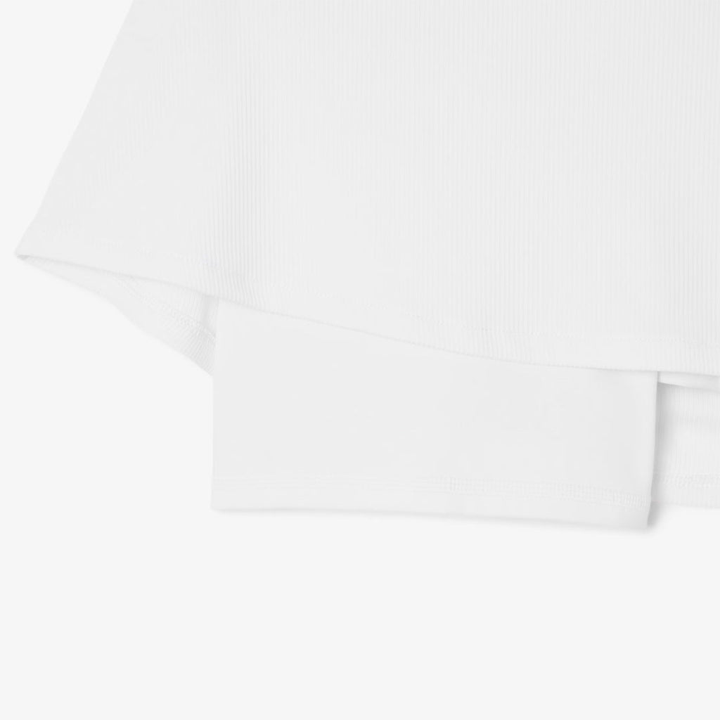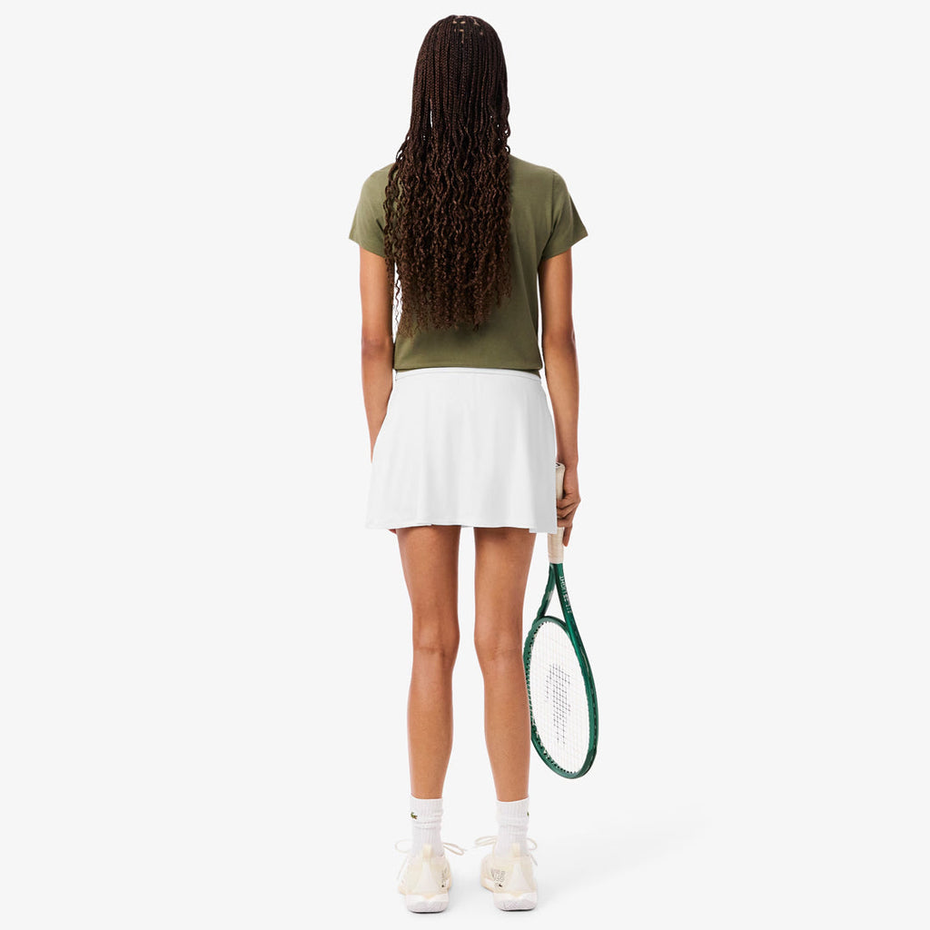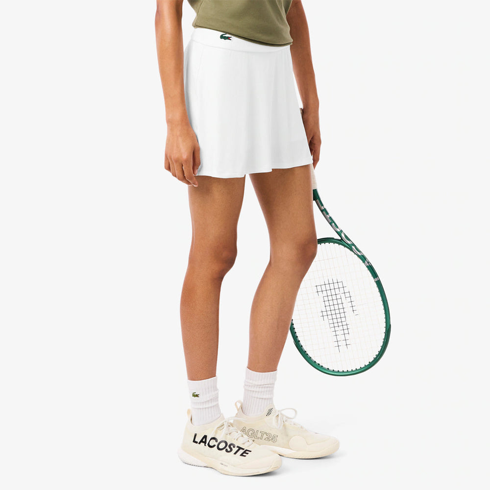 Flattering white tennis skirt to help upgrade your wardrobe. The perfect skirt for any sport from Lacoste, sportswear experts since 1933. Made from a stretchy ribbed knit fabric with an integrated liner for freedom of movement, plus Ultra Dry technology to keep you feeling fresh. A sleek, minimalist design with luxe details, finished with a signature crocodile for an elegant touch.