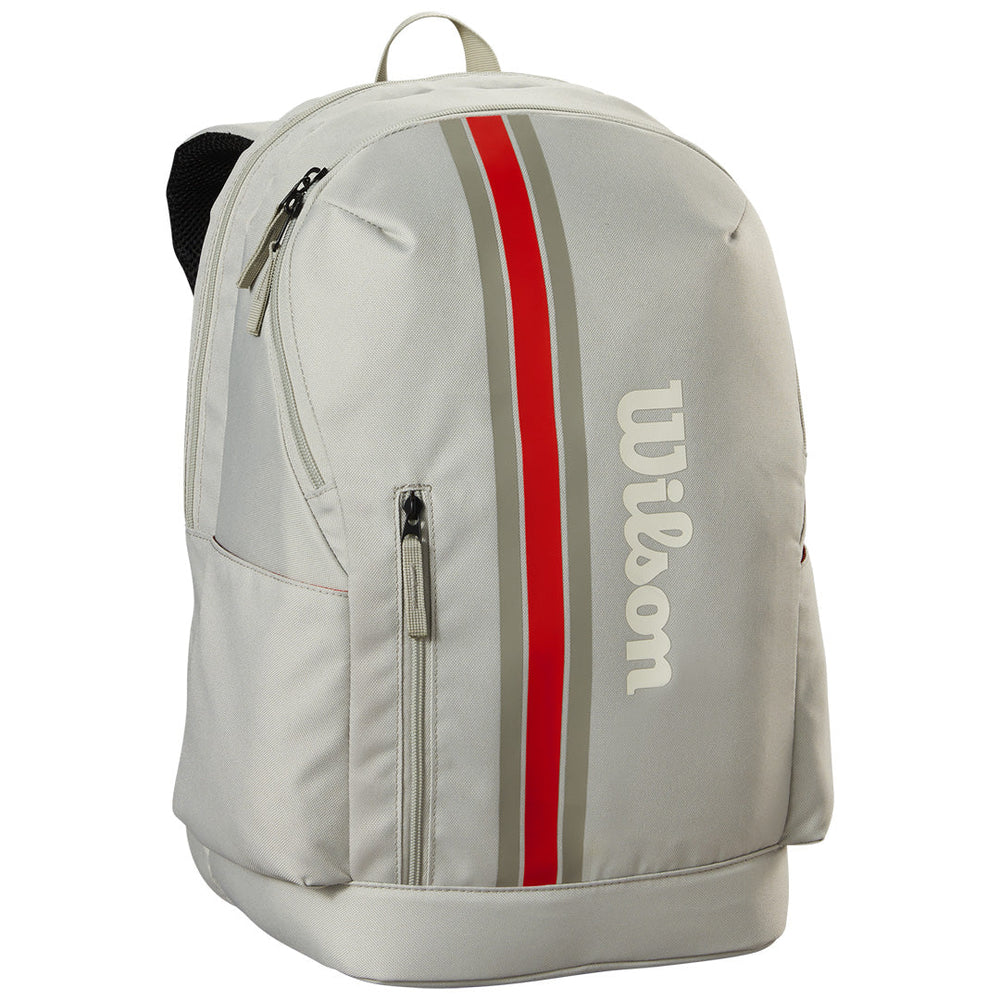 Great tennis backpack for sport of everyday use. Getting to and from the tennis courts just got easier. Wilson's latest Team Backpack carries everything club players need to play. It's got a lockable zip pocket with room for one or two uncovered racquets plus apparel and accessories. Two side pockets can be used to hold water bottles or tennis ball cans, and the front zip pocket is perfect for personal items or valuables. Padded, adjustable shoulder straps and a grab handle provide carrying options.