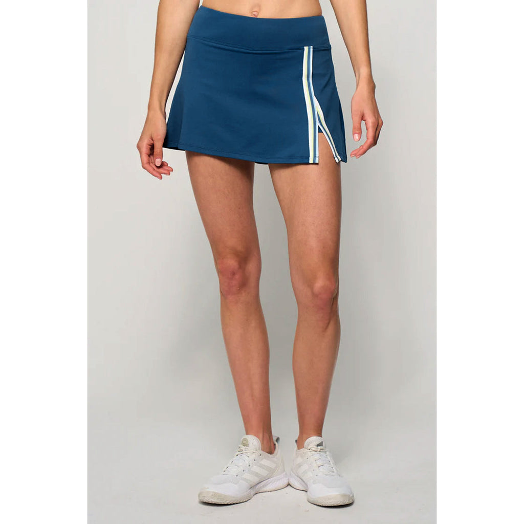 This contemporary and sleek design makes for a stylish skirt, in cool blues and peridot. This modern A-line skirt combines athletic flair with sleek design. It features an angled seam accented by striped rib detail and a front left leg slit for added movement and style. Laser-cut perforated fabric at the shoulders enhances breathability, while the 13" length and body-skimming fit create a flattering, performance-ready silhouette.