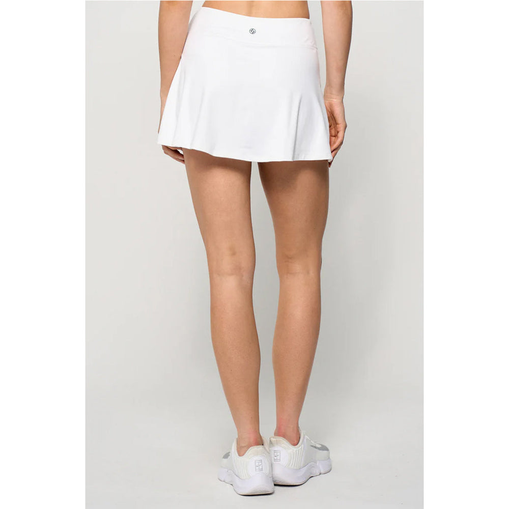 This contemporary and sleek design makes for a stylish skirt, in crisp white and blues. This modern A-line skirt combines athletic flair with sleek design. It features an angled seam accented by striped rib detail and a front left leg slit for added movement and style. Laser-cut perforated fabric at the shoulders enhances breathability, while the 13" length and body-skimming fit create a flattering, performance-ready silhouette.
