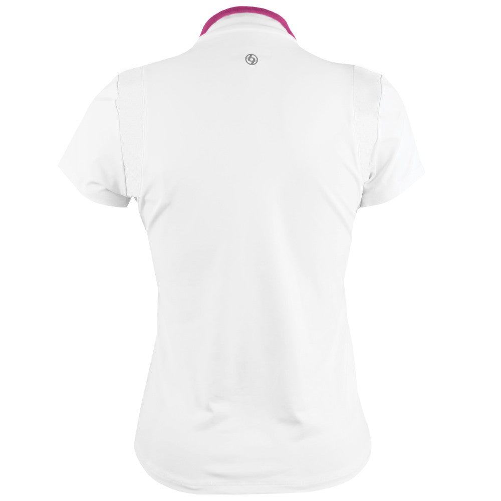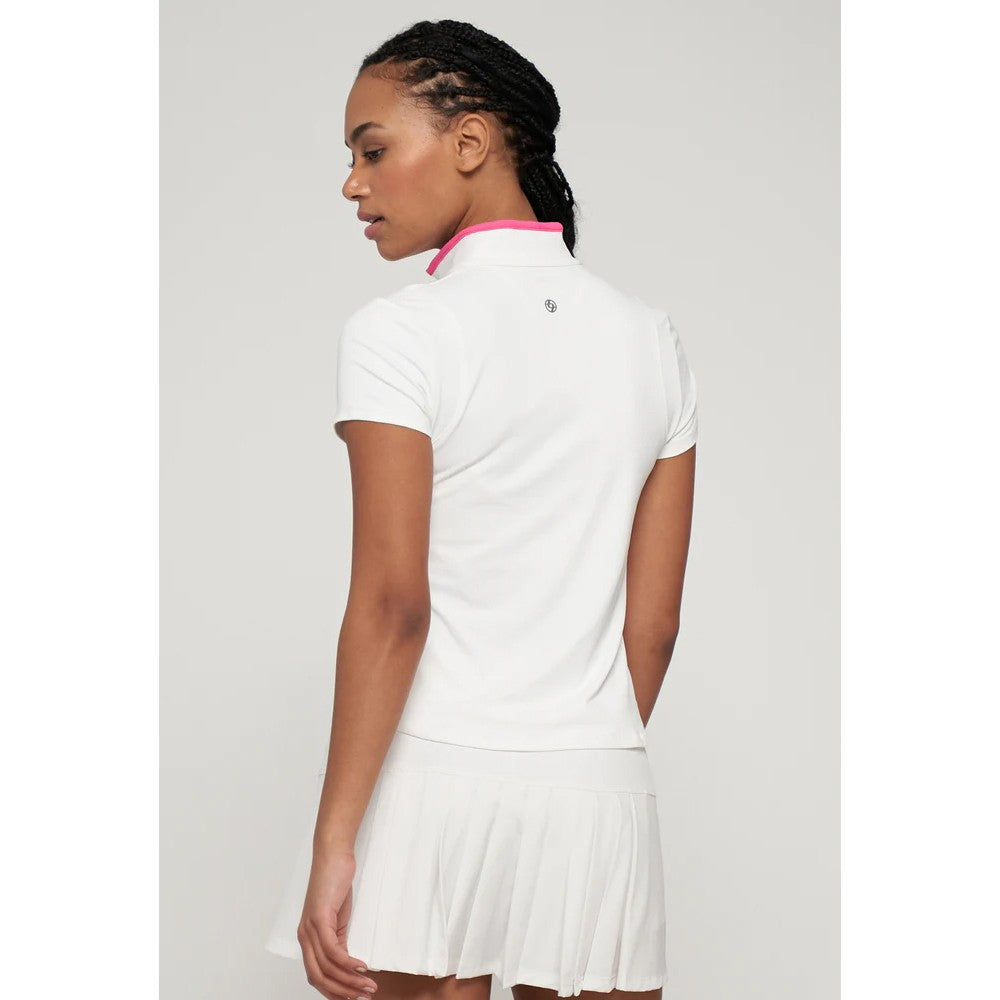 Stylish shirt that is both comfortable and stylish on court in classic white with pink. The Roller Tee has a stand-up collar with contrast color details on the collar and front placket. The tonal mesh panels at the shoulders provide breathability for the golf course or tennis court. Elevate your sportswear game with this versatile and stylish top.
