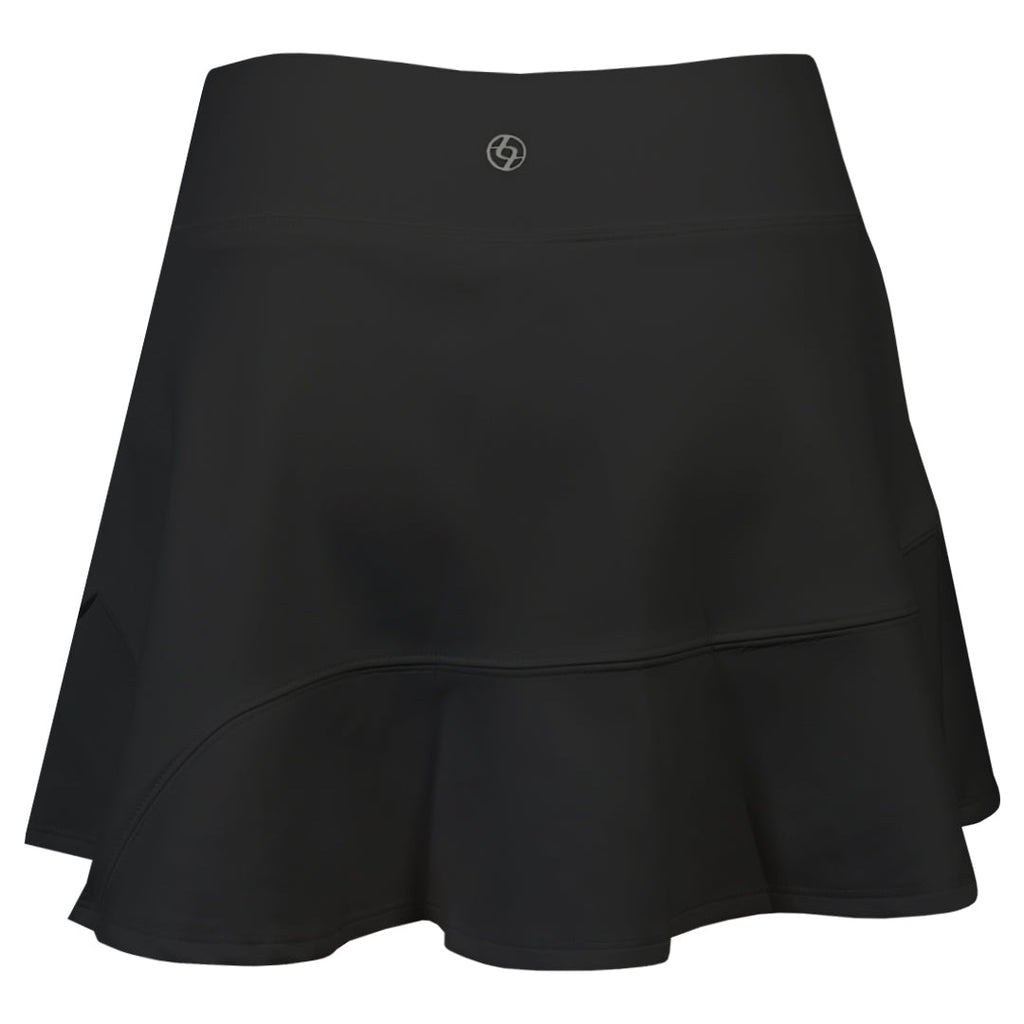 Sleek and flowy skort in black. This skirt features a curved seam above the hemline with flutter detailing for a soft, flowing look. A crossover detail at the left front adds a stylish touch, while the 13" length and body-skimming fit create a flattering, feminine silhouette.