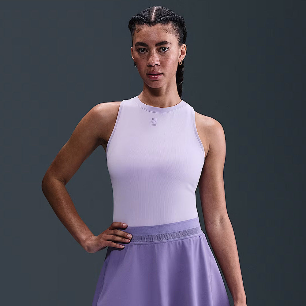 In a soft Hydrangeas hue, this NikeCourt tank delivers a snug, high-performance fit with a sleek feel. Ribbed on the outside and smooth on the inside, it offers stretch where you need it most—so you can move freely without distractions. Nike Dri-FIT technology helps keep you dry and focused, while the high neckline provides extra coverage through every swing and stance. Finished with a NikeCourt logo at the chest. Made from 71% polyester and 29% elastane for breathable support.
