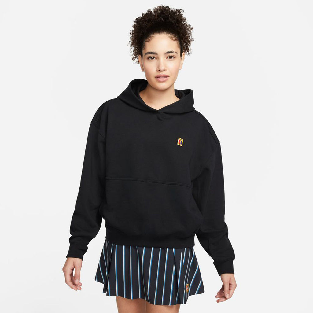 Comfy black hoodie to stay warm at all times. NikeCourt Women's Fleece Tennis Hoodie A LAYER THAT GOES EVERYWHERE. From the court to the concrete and everywhere in between, the NikeCourt Hoodie is your new favorite layer. It's got smooth French terry fabric that feels soft and warm. Stretchy ribbed fabric on the sides and under the sleeves gives you plenty of room to move. French terry fabric is made with at least 75% sustainable materials, using a blend of recycled polyester and organic cotton fibers. The blend is at least 10% recycled fibers or at least 10% organic cotton fibers.