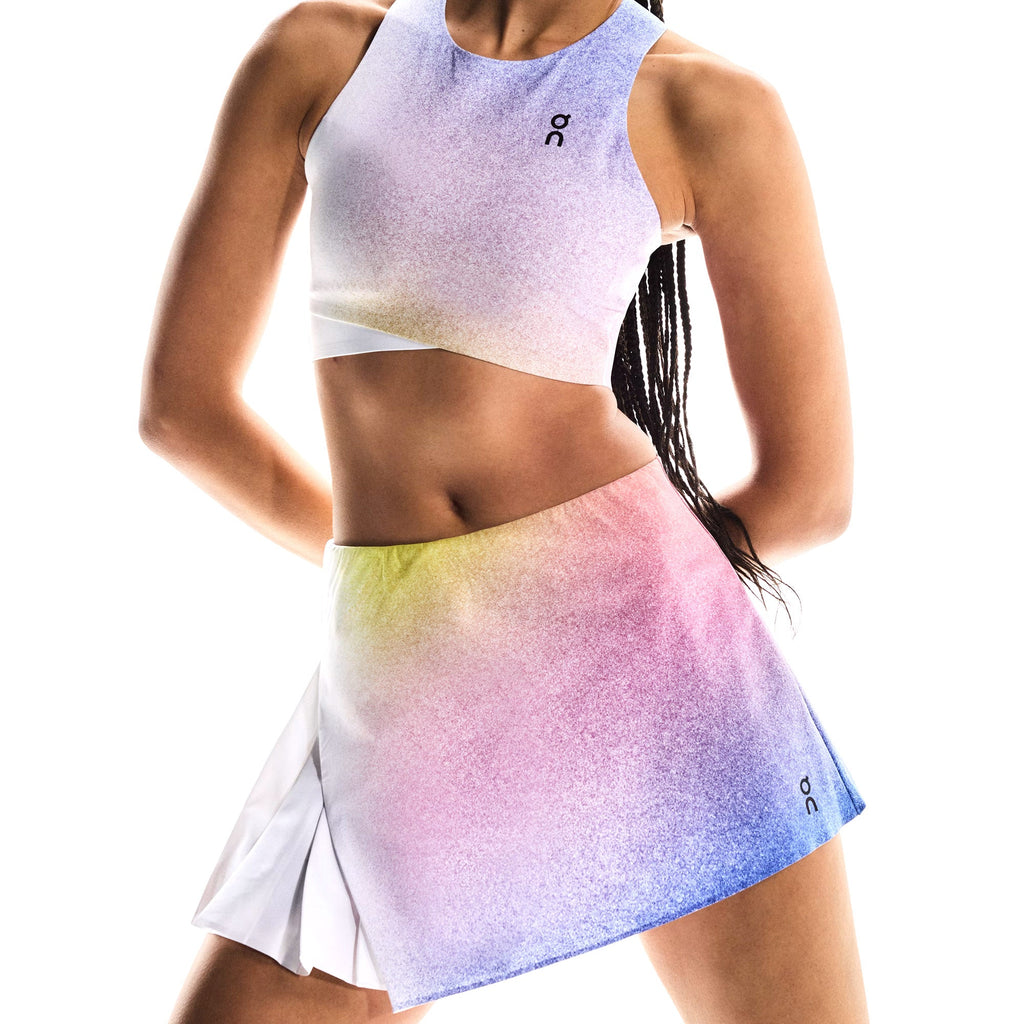 Add a playful punch to your tennis wardrobe with this vibrant multi-coloured skort. Designed for both performance and style, it features a pleated overlap construction and soft, stretchy fabric for all-day comfort. The built-in inner tights come equipped with two practical pockets—perfect for stashing tennis balls or your phone—while the bonded hem and elasticated waistband offer a smooth, secure fit. Finished with the On logo on the front pleat for a sporty touch.