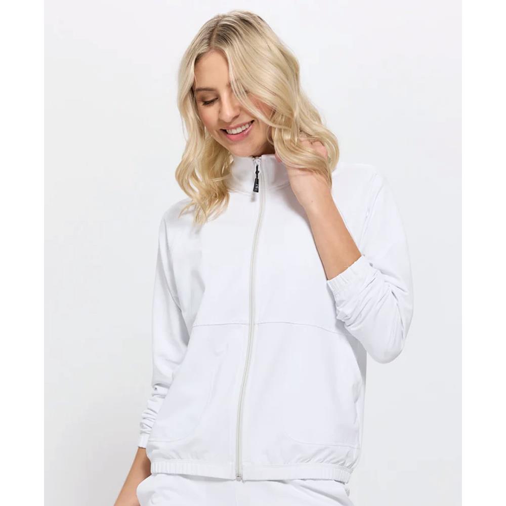 Great style on and off court. This jacket is designed in a french terry fabric inside- with a slight brushed back for added warmth. It has a full centre front zip, two front patch pockets and elastic for the cuffs and hem. If you're looking for a full warm up suit, its partner is the Wide Leg Pant. This is a relaxed fit.