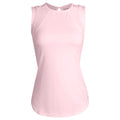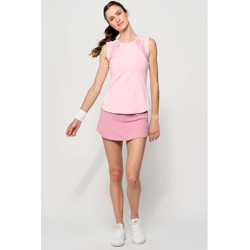 Flattering yet athletic pink tank. One of the best tanks in the LIJA Collection. This lightweight, body skimming tank has wide tank straps, mesh paneling on shoulder seams and upper back. The back panel has a keyhole opening and slight gathers for a feminine touch.