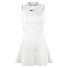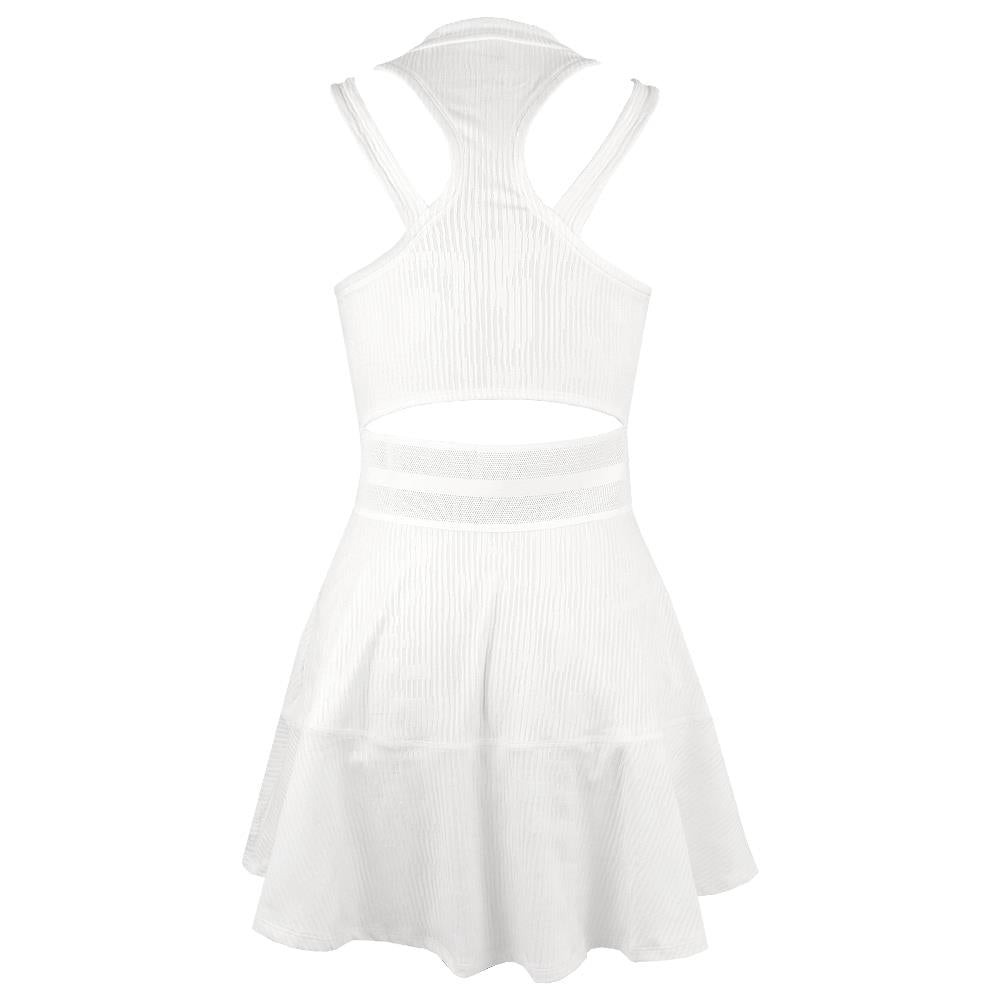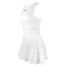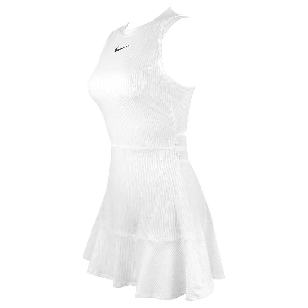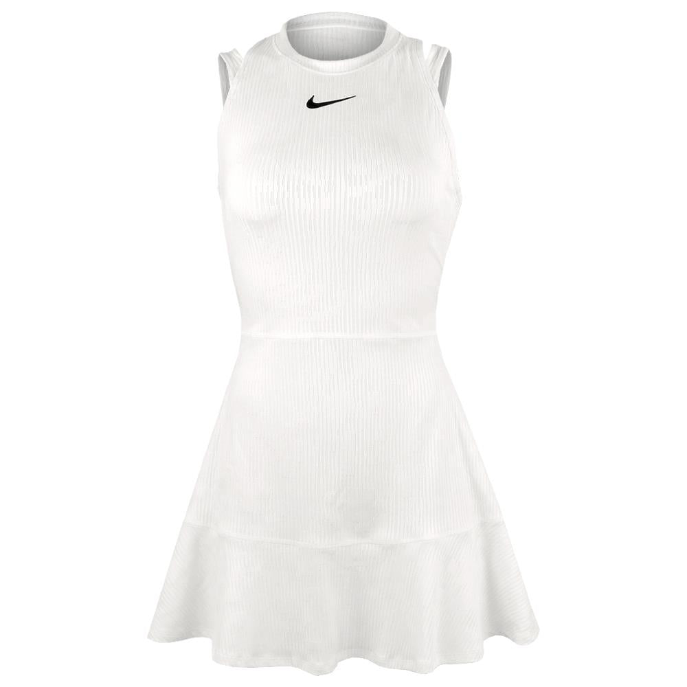 Sleek, cool and fun style on court. Elevate your game feeling the legendary tournament in your bones, the manicured grass underfoot, the echoes of the greats. This dress upholds tradition with its classic white colour and is made for all your stances with its high neckline. Ventilation features and sweat-wicking technology help keep you cool and dry so your game heats up more than you. Plus, stretchy fabric with a drop hem at the back leaves you covered and free to make all the dynamic movements you need to. Nike Dri-FIT technology moves sweat away from your skin for quicker evaporation, helping you stay dry and comfortable. Opening at lower back and mesh elastic waistband offer a snug hold while offering optimal breathability. Strap design offers versatile bra coverage.