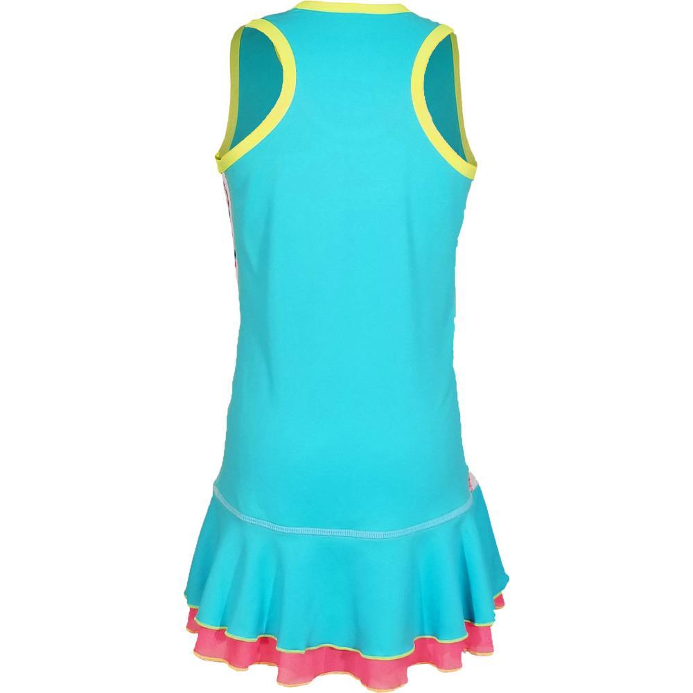 She will stand out on court with this fun and festive dress from Sofibella. This racerback dress features beautiful accents on the side, a double ruffle at the hem, sun protection and fun pops of colour.